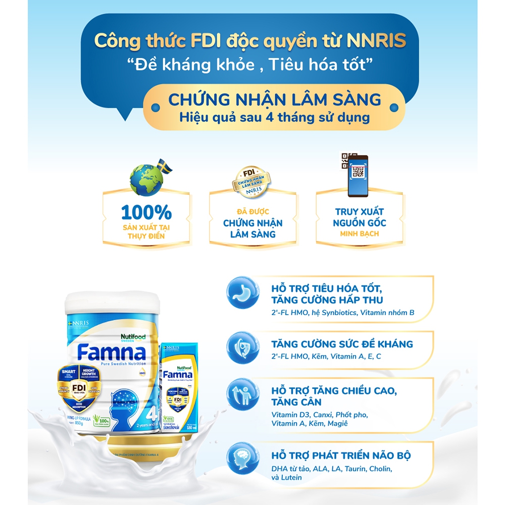 | Hướng dẫn sử dụng | 1. Rửa tay và dụng cụ thật sạch trước khi pha. 2. Đun sôi nước trong 5 phút và để nguội dần đến 50 °C. 3. Pha 7 muỗng gạt Famna 4 (khoảng 36 g) với 180 ml nước chín ấm (khoảng 50 °C). 4. Khuấy đều cho đến khi hòa tan hoàn toàn. |