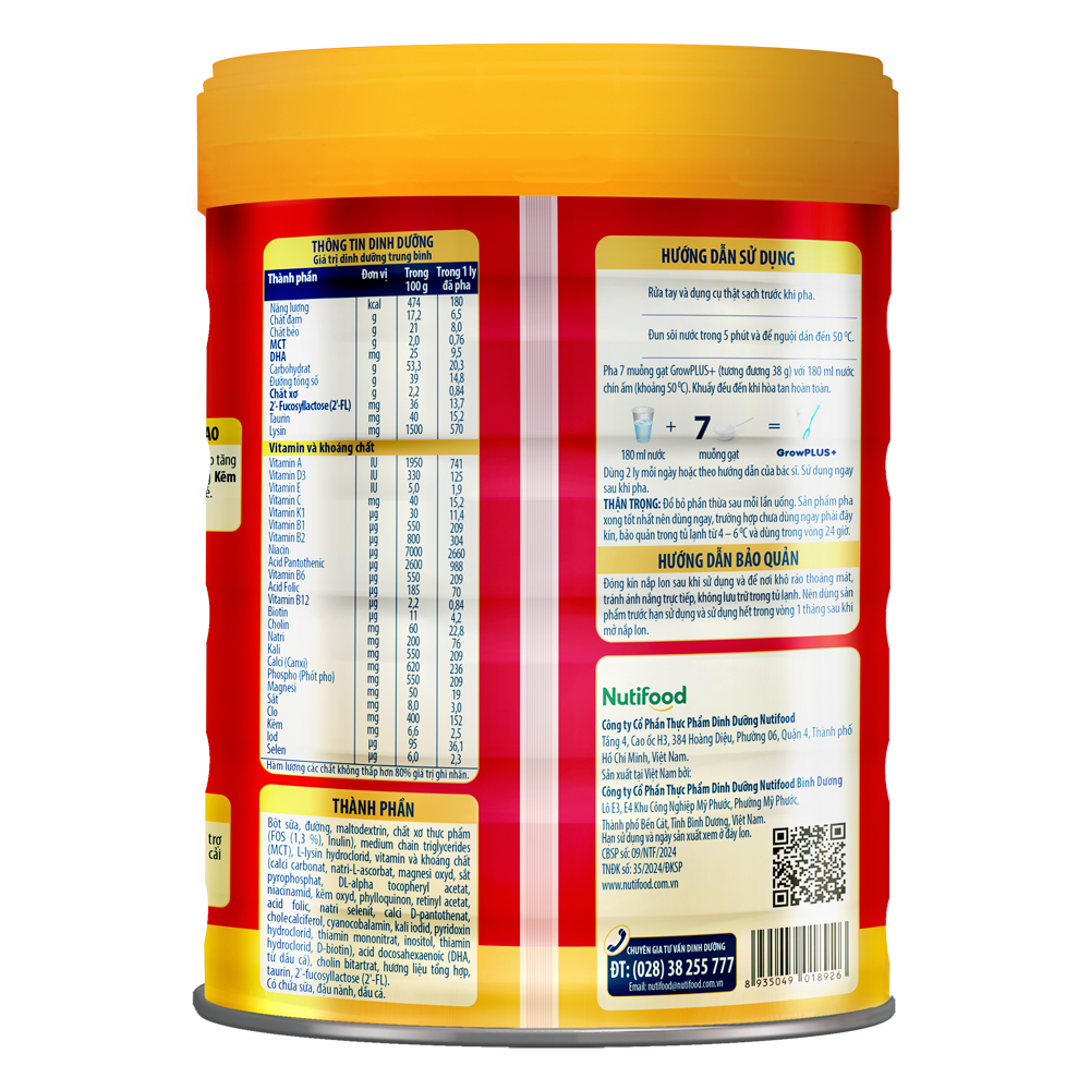 | Hướng dẫn sử dụng | . Rửa tay và dụng cụ thật sạch trước khi pha. . Đun sôi nước trong 5 phút và để nguội dần đến 50 độ C. . Pha 7 muỗng gạt GrowPlus+ (tương đương 38 g) với 180 ml nước chín ấm (khoảng 50 độ C). . Khuấy đều đến khi hòa tan hoàn toàn. . Dùng 2 ly mỗi ngày hoặc theo hướng dẫn của bác sĩ. |