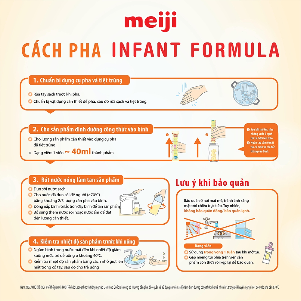 | Hướng dẫn sử dụng | . Rửa tay sạch sẽ sau đó pha sữa cho một lần uống. Cần uống sữa trong vòng 2 tiếng sau khi pha. . Không cho trẻ uống sữa thừa. . Cắt đầu túi sản phẩm. Cầm túi cho viên vào bình đã được khử trùng. . Cho nước đun sôi để nguội khoảng 70 độ vào bình, khoảng 2/3 so với số sữa sẽ pha được. Đậy nắp lại và lắc theo hình tròn cho sữa tan (khoảng 10 giây). Chú ý kẻo bỏng vì bình sẽ nóng lên. . Sau đó lại bổ sung nước đun sôi để nguội cho đủ lượng nước cần phải có. . Đậy nắp bình rồi lắc nhẹ. Để nguội đến khi thấy nhiệt độ sữa ở mức tương đương nhiệt độ cơ thể mới cho trẻ uống. |
