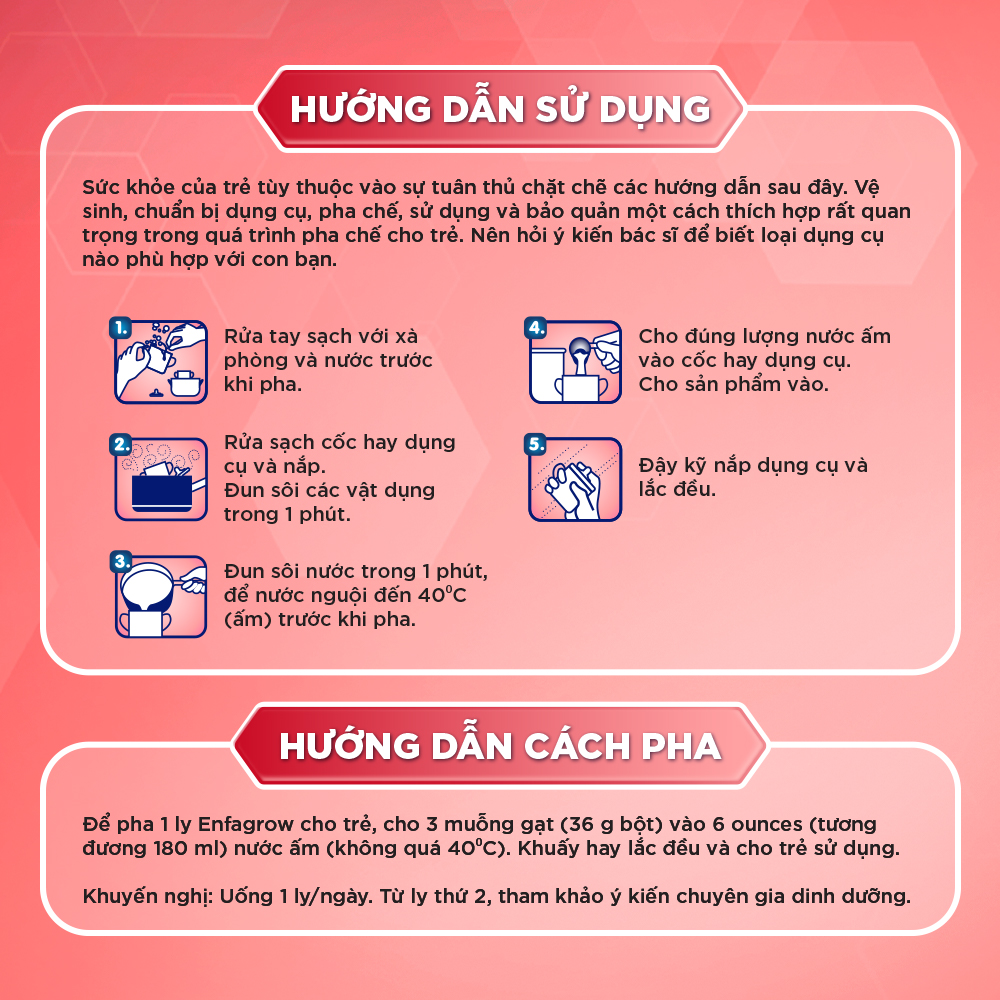 | Hướng dẫn sử dụng | . Sức khỏe của trẻ tùy thuộc vào sự tuân thủ chặt chẽ các hướng dẫn dưới đây: . Vệ sinh, chuẩn bị dụng cụ, pha chế, sử dụng và bảo quản một cách thích hợp rất quan trọng trong quá trình pha chế cho trẻ, nên hỏi ý kiến bác sĩ để biết loại dụng cụ nào phù hợp với con bạn . Rửa tay sạch với xà phòng và nước trước khi pha . Rửa sạch cốc hay dụng cụ và nắp. . Đun sôi các vật dụng trong 1 phút . Đun sôi nước trong 1 phút. . Để nước nguội đến 40 độ C (ấm) trước khi pha . Cho đúng lượng nước ấm vào cốc hay dụng cụ . Cho sản phẩm vào, đậy kỹ nắp dụng cụ và lắc đều . Để pha một ly Enfagrow cho trẻ, cho 3 muỗng gạt (36g bột) vào 6 ounces (tương đương 180ml) nước ấm (không quá 40 độ C). . Khuấy hay lắc đều và cho trẻ sử dụng. |