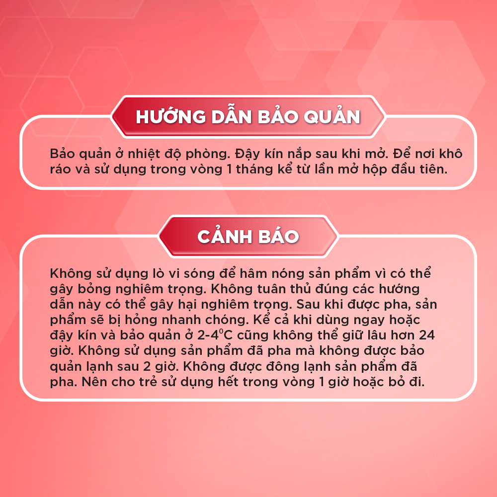 | Hướng dẫn bảo quản | . Bảo quản ở nhiệt độ phòng, tránh những nơi có nhiệt độ cao. . Đóng chặt nắp lại sau khi mở hộp. . Để nơi khô ráo và sử dụng trong vòng 1 tháng. |