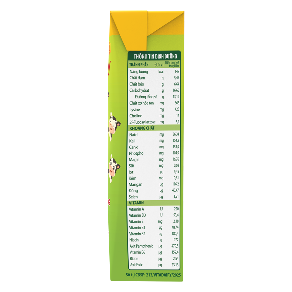 Nước, Sữa bột (8.2%), Sucrose, Chất béo sữa, Dầu thực vật, Chất xơ hòa tan (FOS), L-Lysine HCL, Chất ổn định (460(i),466,407), Chất nhũ hóa(471), Sữa non, Khoáng chất (Canxi, Magie, Sắt, Kẽm, Đồng, Iod, Mangan, Selen), Vitamin (Vitamin A,D3,E,K1,C,B1,B2,B6,B12,Niacin, Biotin, Axit Folic, Axit Pantothenic), DHA từ dầu cá, Hương tổng hợp dùng cho thực phẩm, Chất chống Oxy hoá (307b)