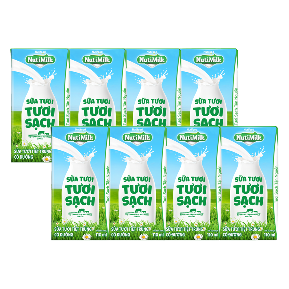Combo 2 lốc sữa tươi sạch tiệt trùng Nutimilk, có đường, 110ml (lốc 4 hộp)