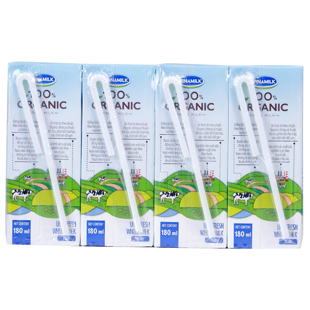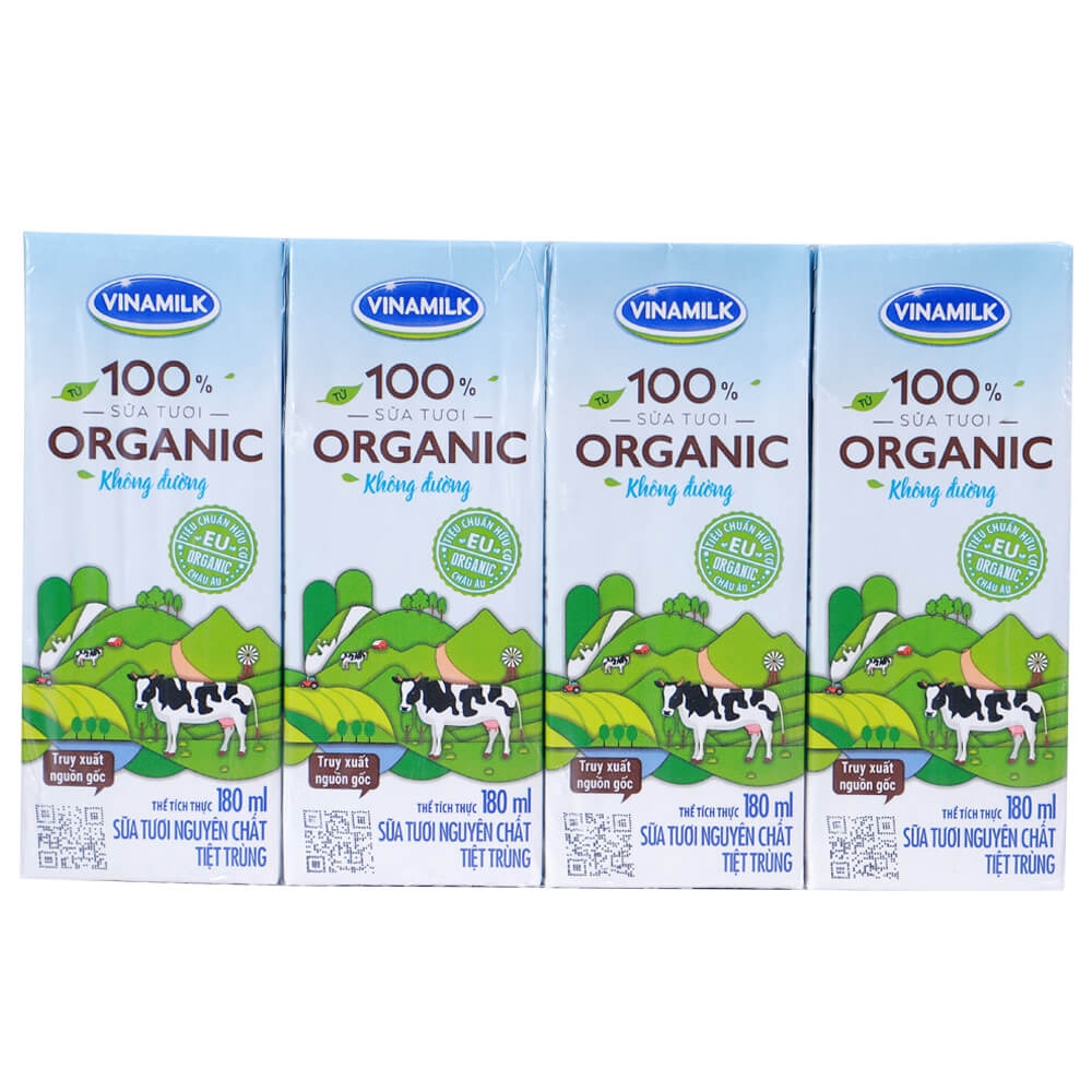 Sữa tươi nguyên chất tiệt trùng - Vinamilk 100 phần trăm Organic 180ml (Lốc 4)
