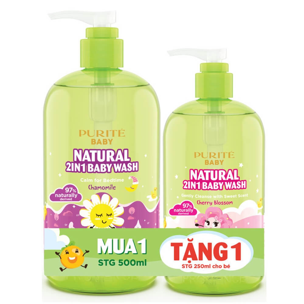 Combo Sữa Tắm Gội Thiên Nhiên Cúc La Mã Purité Baby 500ml và tắm gội Hoa Anh Đào 250ml dành cho bé từ sơ sinh đến 5 tuổi