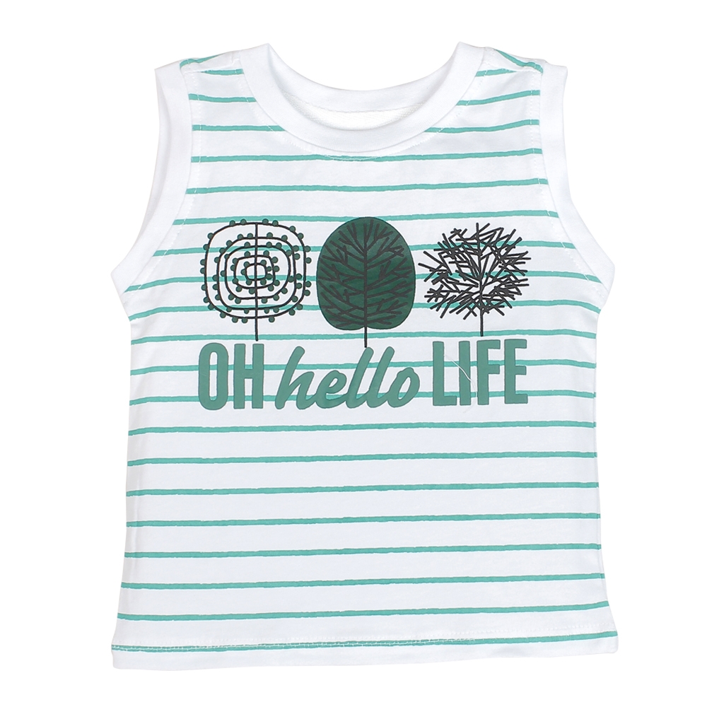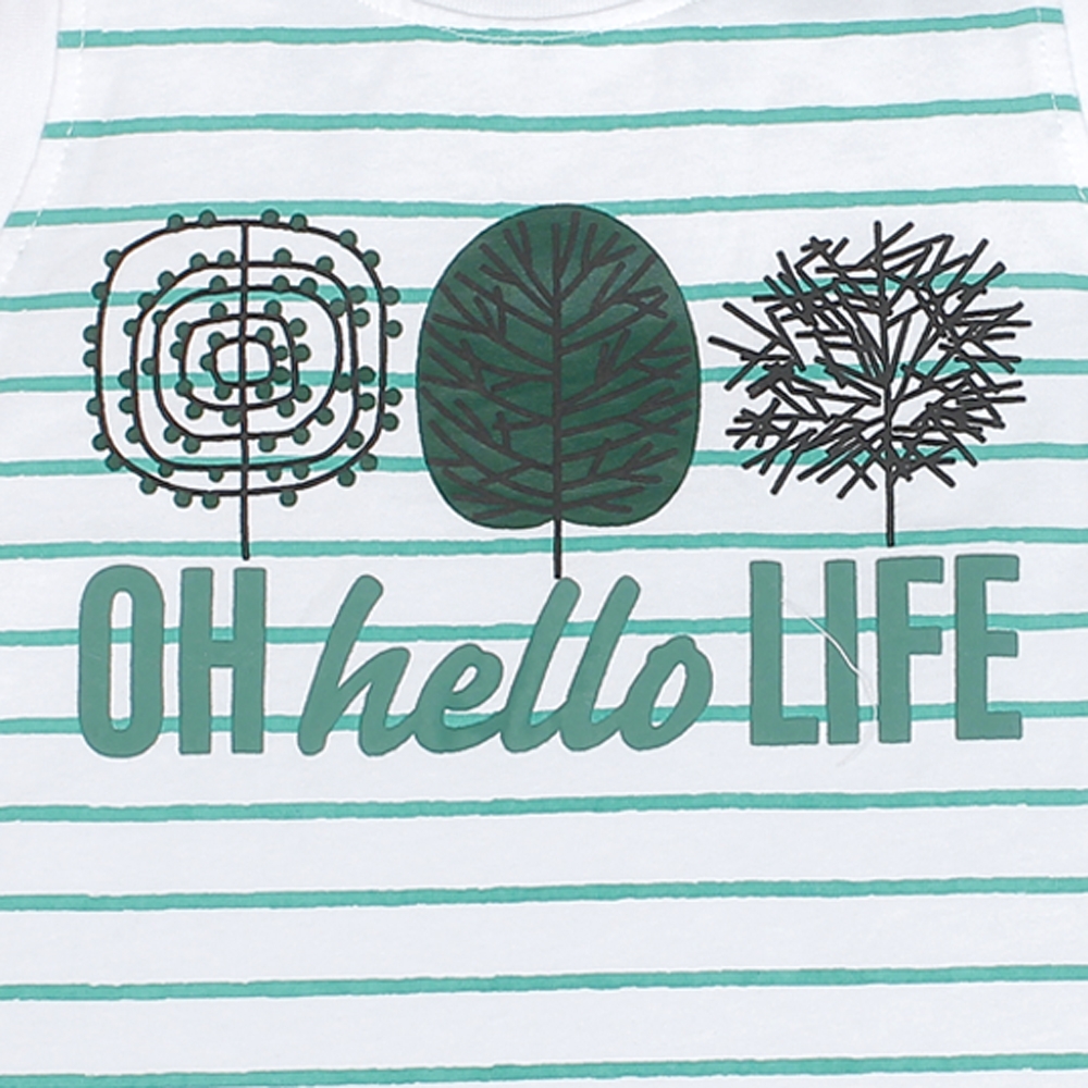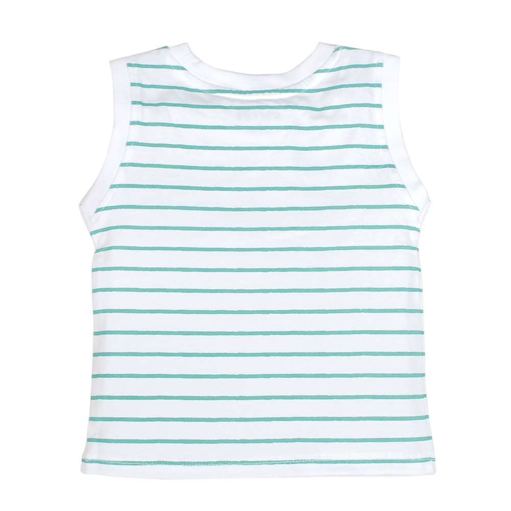 Kiểu dáng năng động với áo sát nách, gam màu xanh nổi bật cùng họa tiết đáng yêu sẽ mang đến phong cách khỏe khoắn, thoải mái và không kém phần thời trang cho bé trai của bạn.