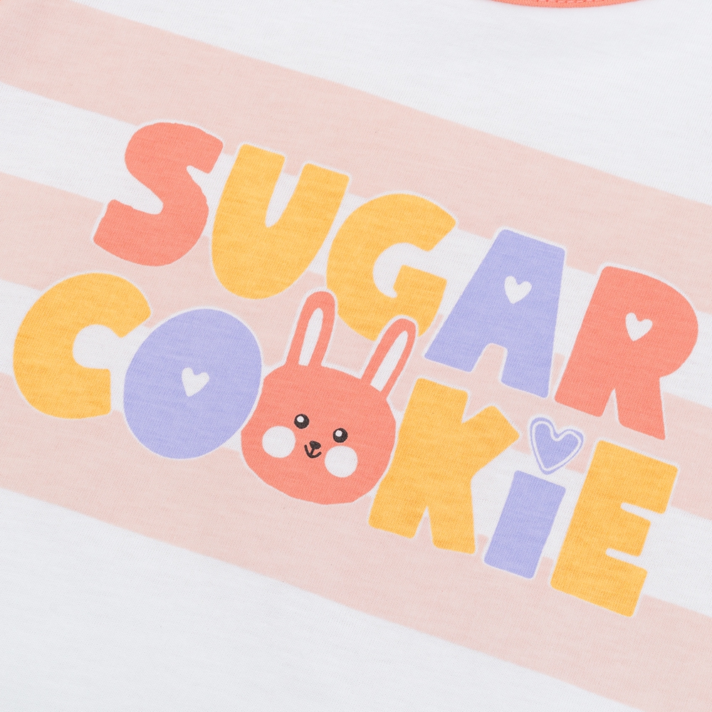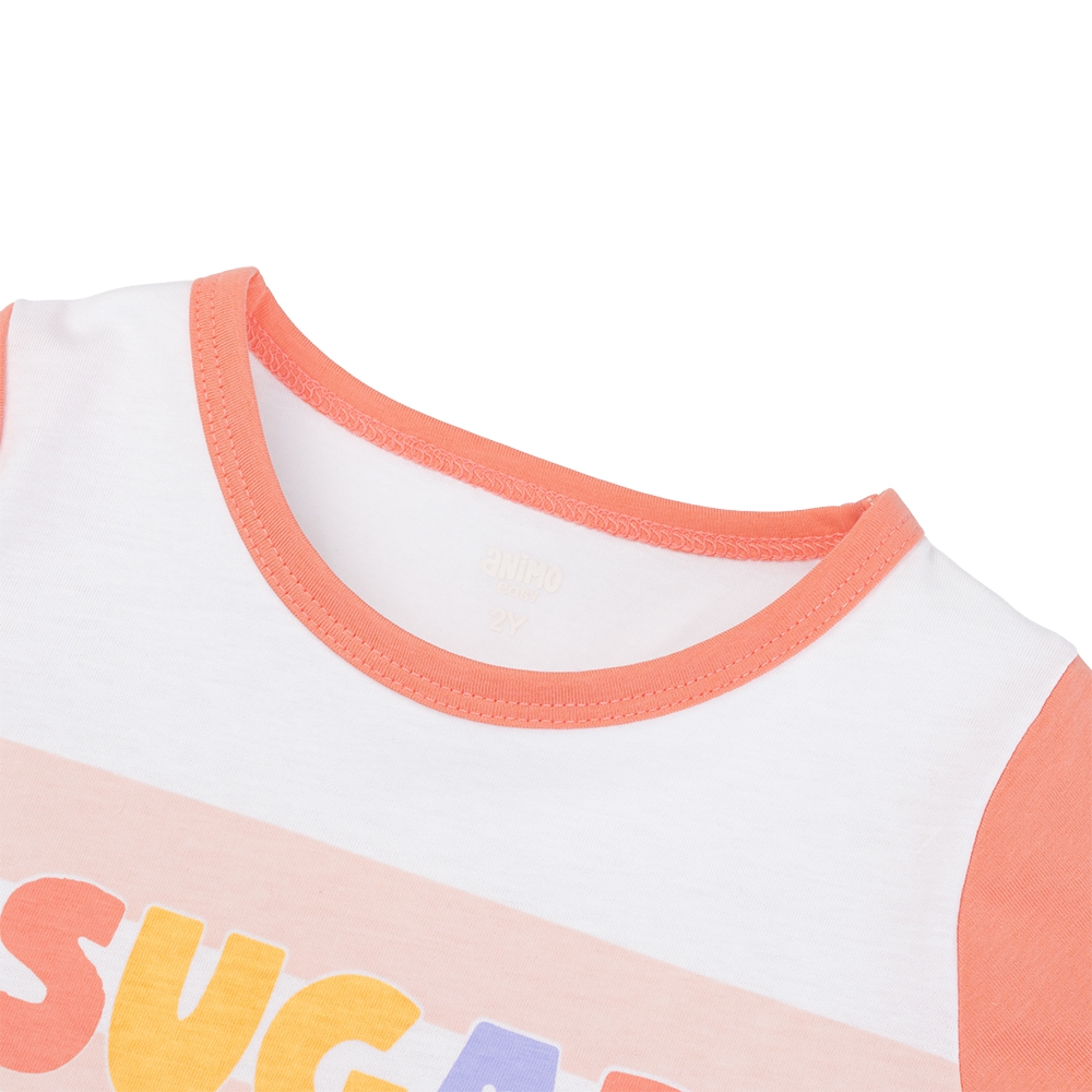 . Áo tay ngắn cổ tròn, viền cổ màu cam nổi bật giúp gương mặt bé sáng hơn.