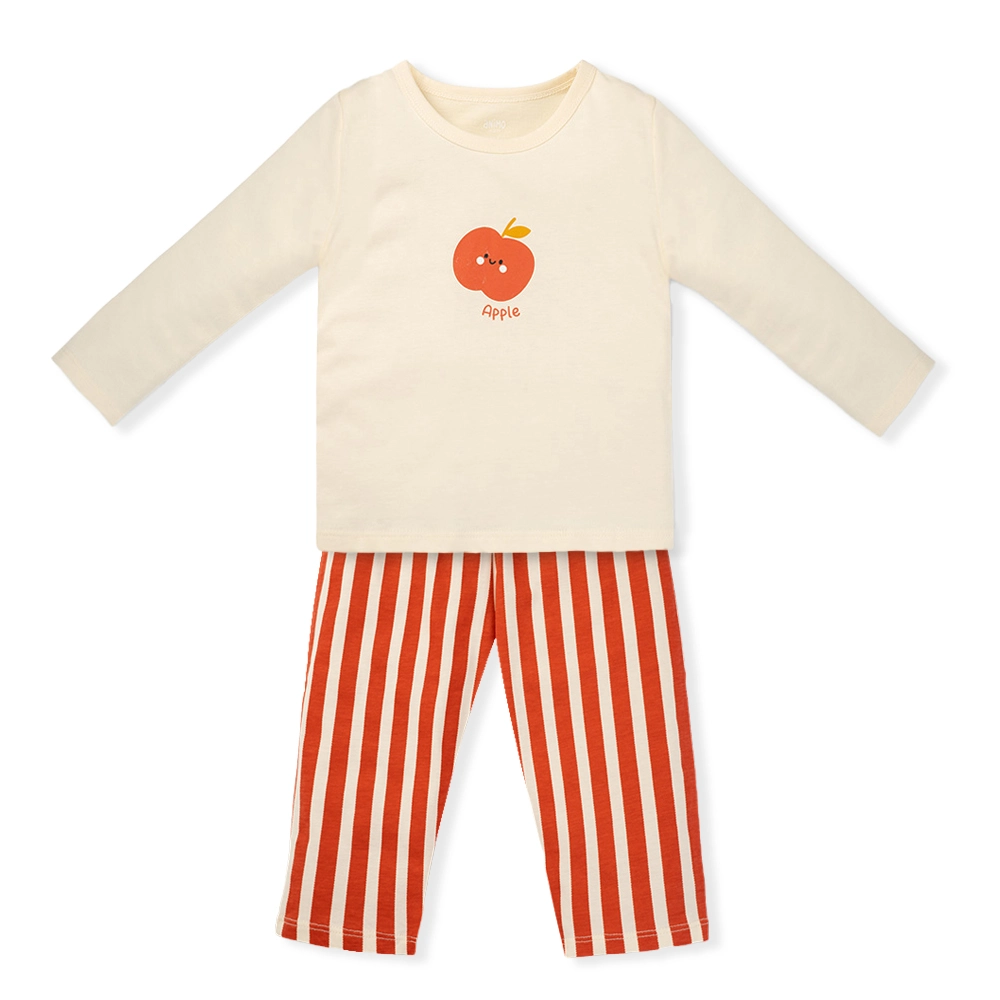 . Áo tay dài màu kem, cổ tròn gọn gàng, in trái táo nhỏ ở trung tâm,