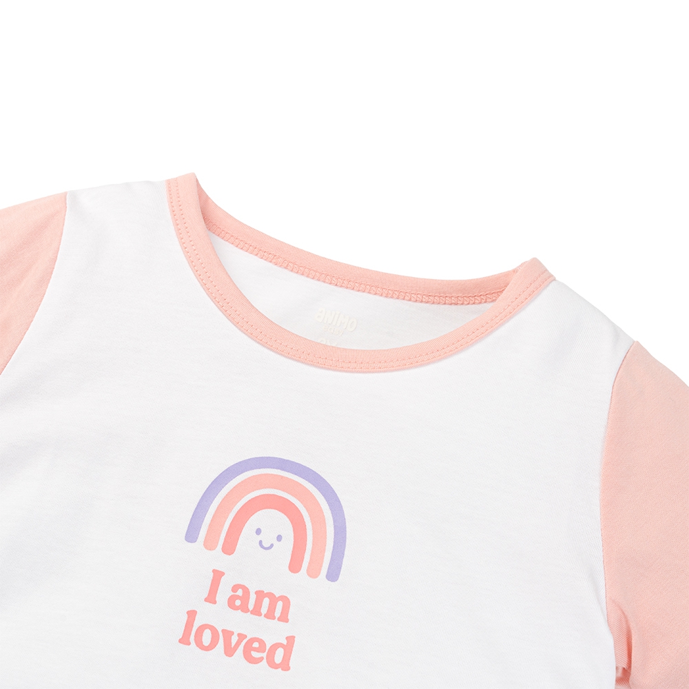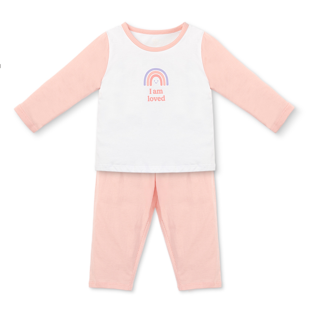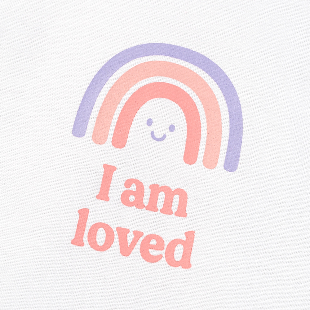 Thiết kế phối màu hồng pastel nhẹ nhàng, in hình cầu vồng “I am loved” đáng yêu.