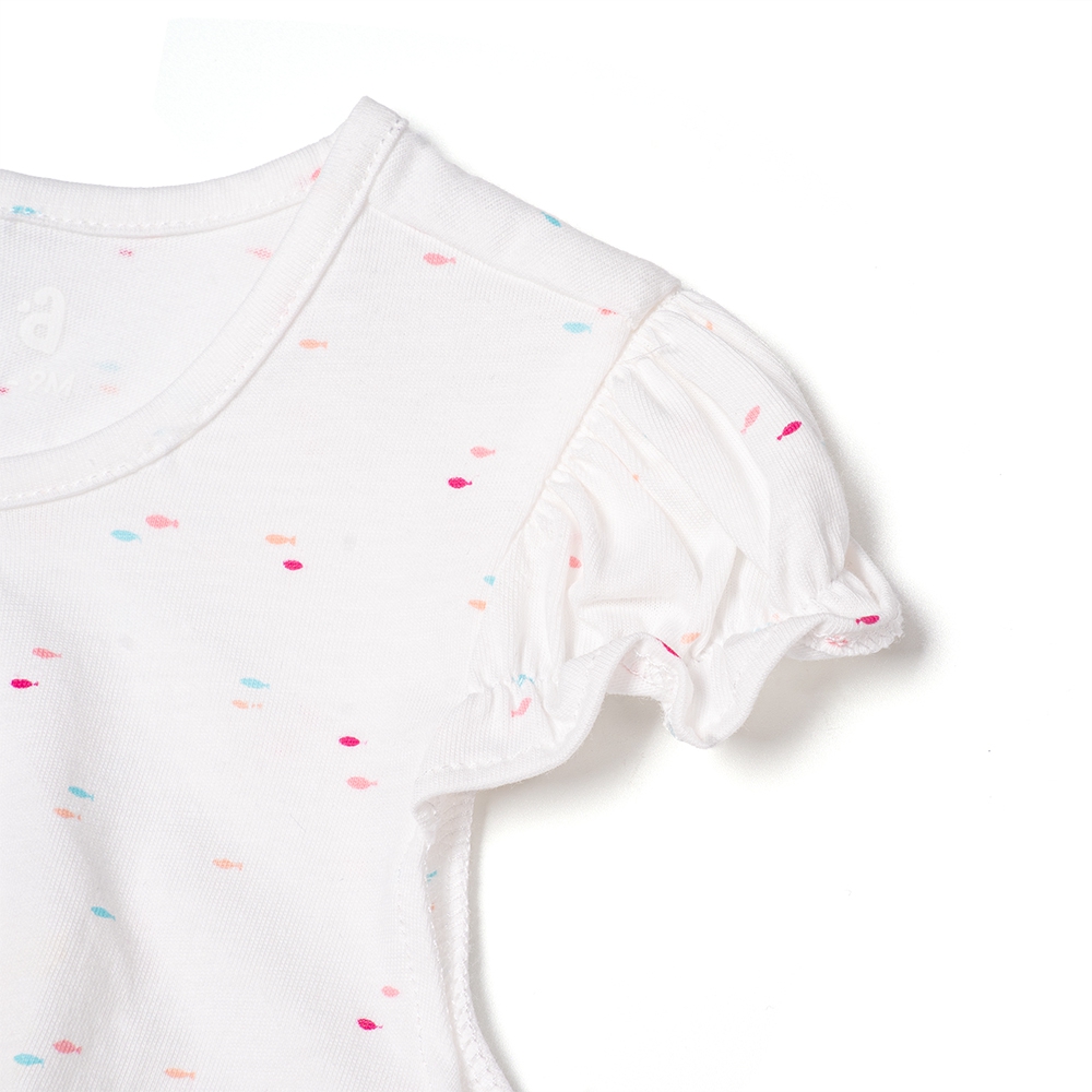 . Hoạ tiết dễ thương giúp bé xinh xắn hơn, phần tay bèo nhún tạo nét điệu đà cho bé gái;