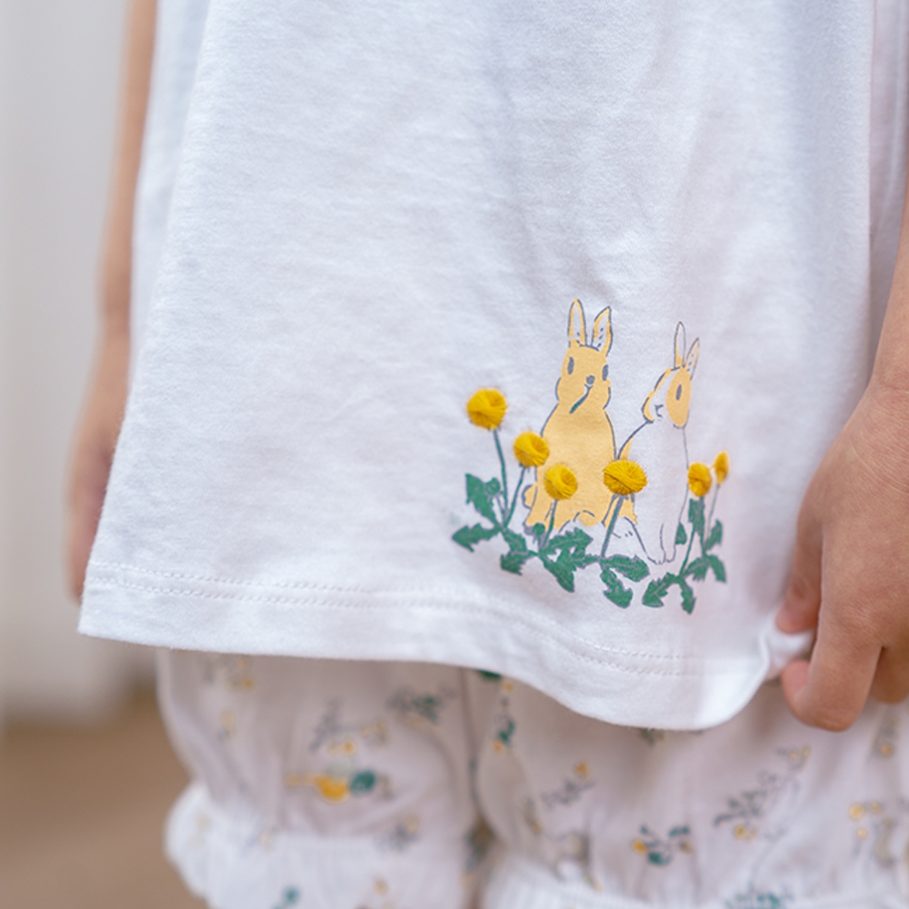 . Áo dáng xoè xinh xắn kết hợp cùng quần hoạ tiết thỏ và thiên nhiên dễ thương;