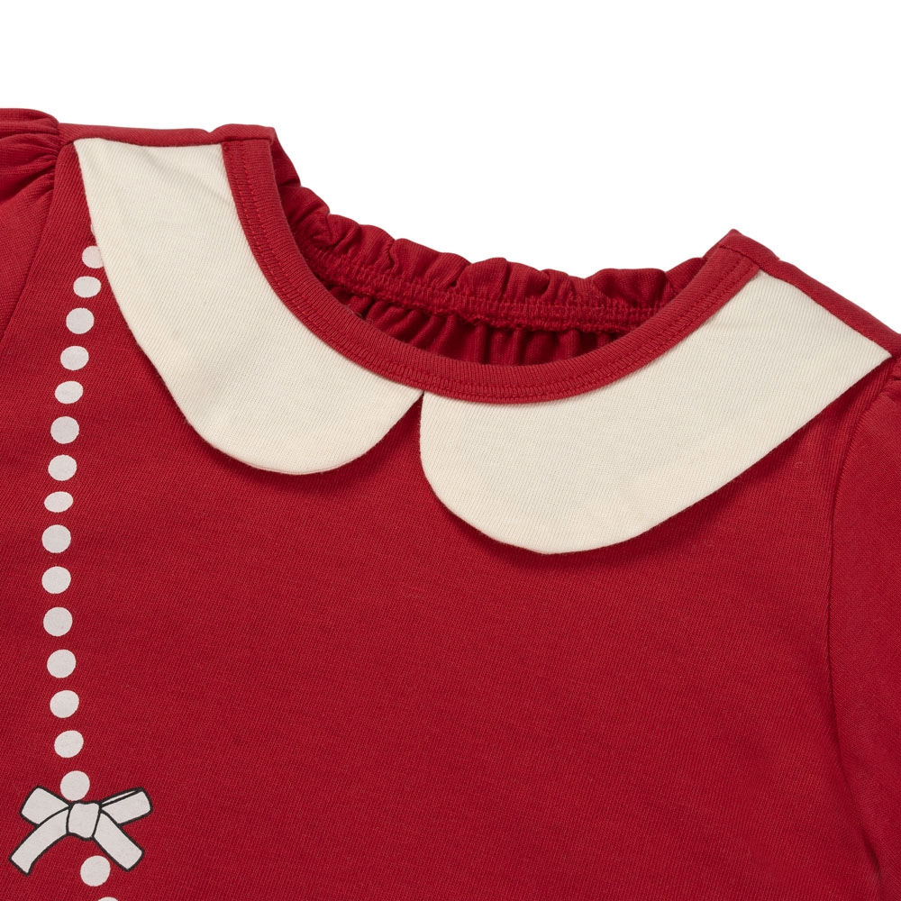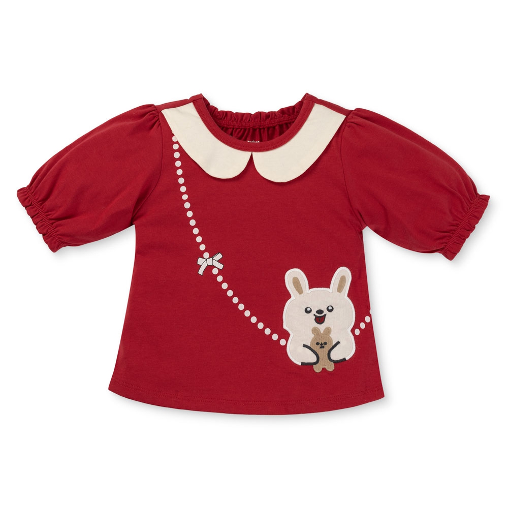 . Áo đỏ in thỏ siêu dễ thương, kết hợp cổ peter pan màu kem tạo điểm nhấn xinh xắn