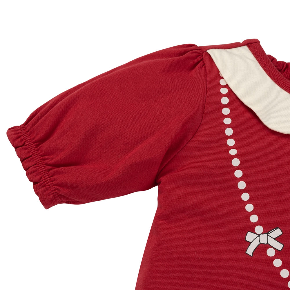 Đầm bé gái tay ngắn Animo – thiết kế phối màu đỏ – kem nổi bật cùng cổ bèo dễ thương và họa tiết thỏ ôm gấu đáng yêu, mang đến vẻ ngọt ngào và duyên dáng cho bé.