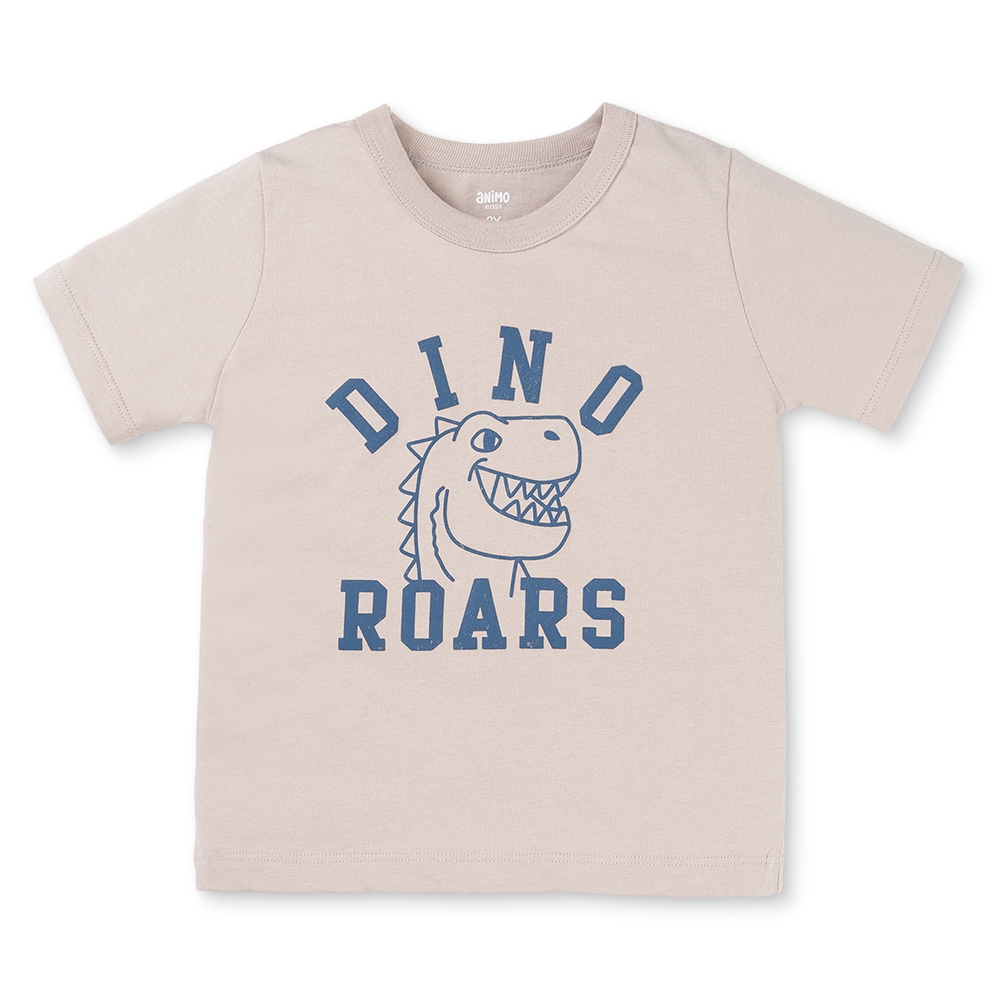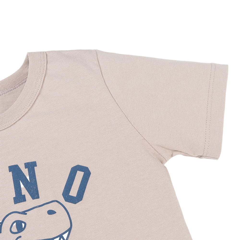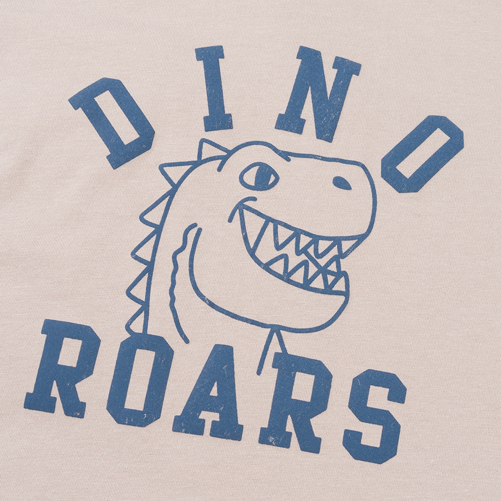 Họa tiết khủng long “DINO ROARS” cực ngầu, tông xanh đậm nổi bật trên nền xám, tạo điểm nhấn cá tính cho bé trai.
