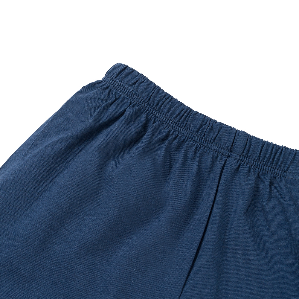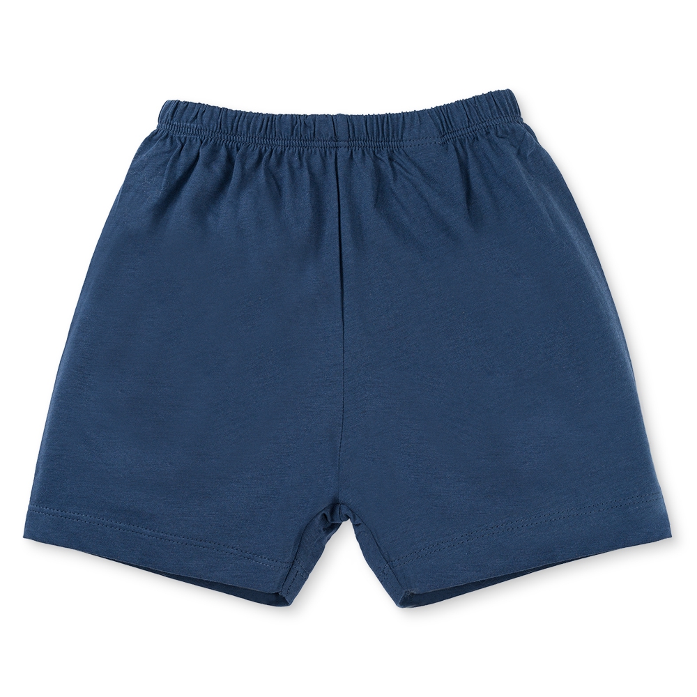 Quần short xanh dương co giãn tốt, hỗ trợ bé chạy nhảy linh hoạt cả ngày mà không bị bó hoặc cộm.