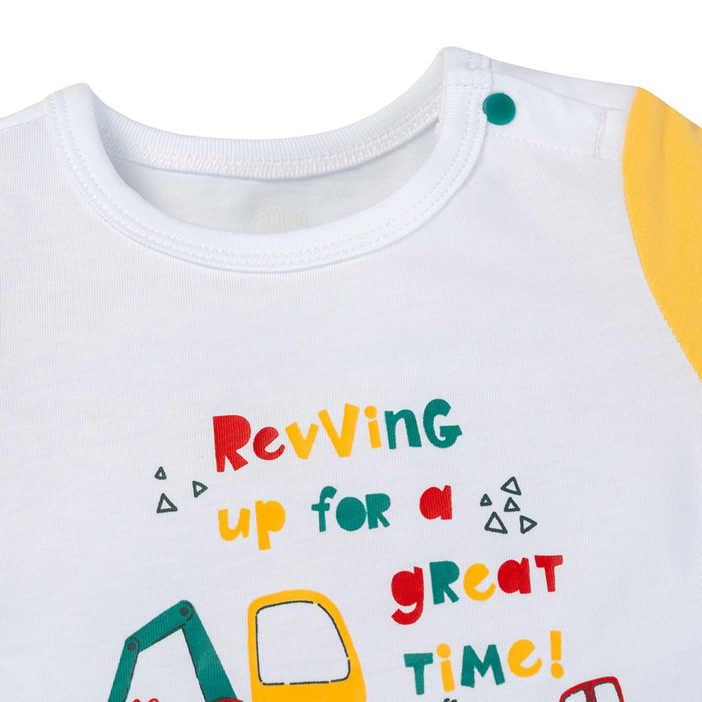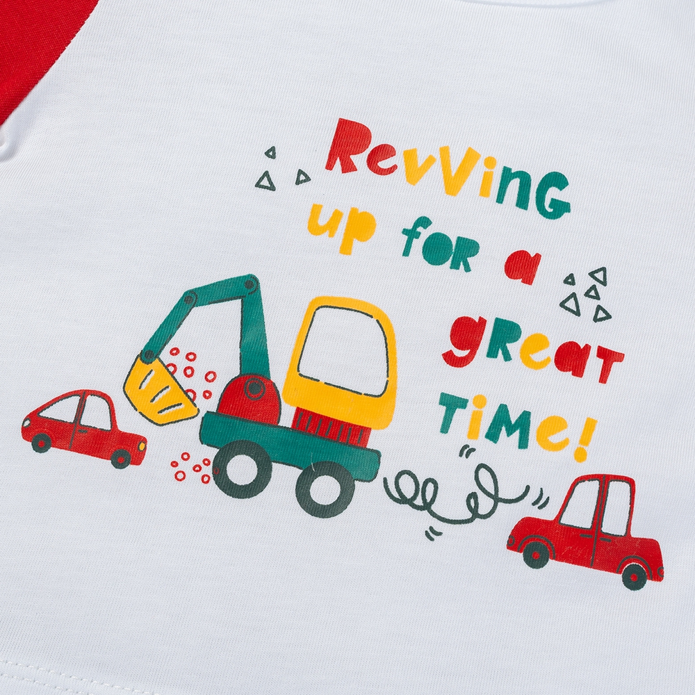 Họa tiết in hình xe xúc, ô tô cùng khẩu hiệu "Revving up for a great time!" ngộ nghĩnh, phù hợp với sở thích khám phá của các bé trai.