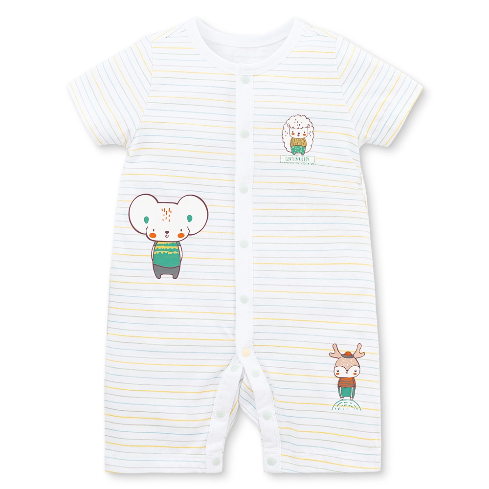 Bodysuit bé trai đùi BST Friends Animo VD0825041 (0–12M, Trắng, NN02) mang thiết kế sọc ngang tươi sáng kết hợp họa tiết các bạn thú đáng yêu – Chuột, Nai và Cừu – tạo nên phong cách vui tươi, năng động cho bé. Form liền thân đùi ngắn giúp bé thoáng mát, dễ vận động, đồng thời mẹ dễ thay tã cho bé trong suốt ngày dài.