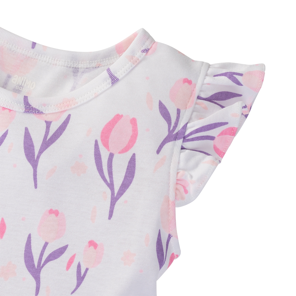 . Tay đầm cộc kết hợp cùng cánh tiên có bèo nhún giúp tăng phần nữ tính cho bé;
