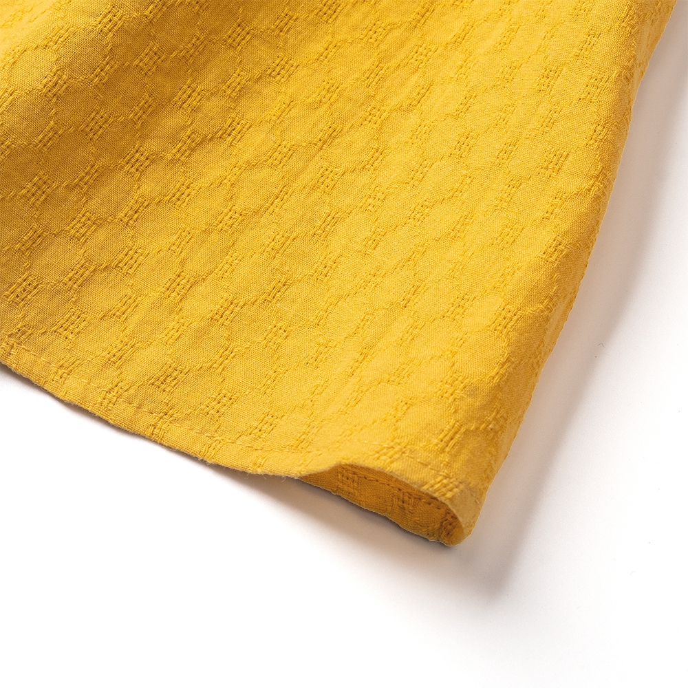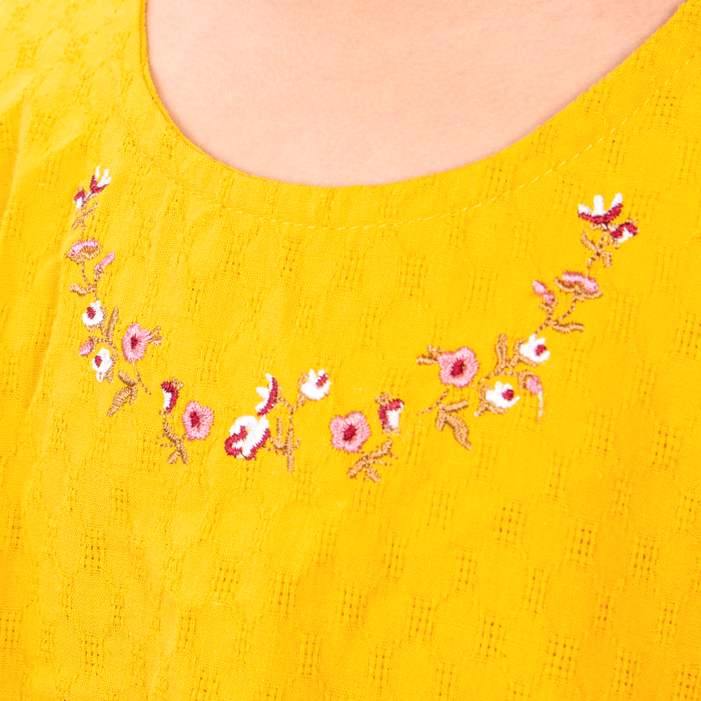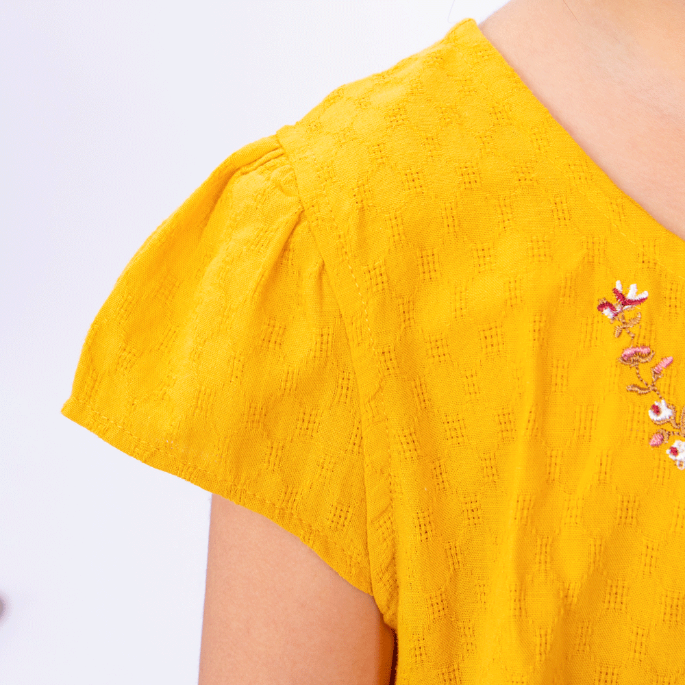 . Hoạ tiết hoa thuê nổi kết hợp cùng màu vàng giúp bé tăng thêm phần dịu dàng và đáng yêu;