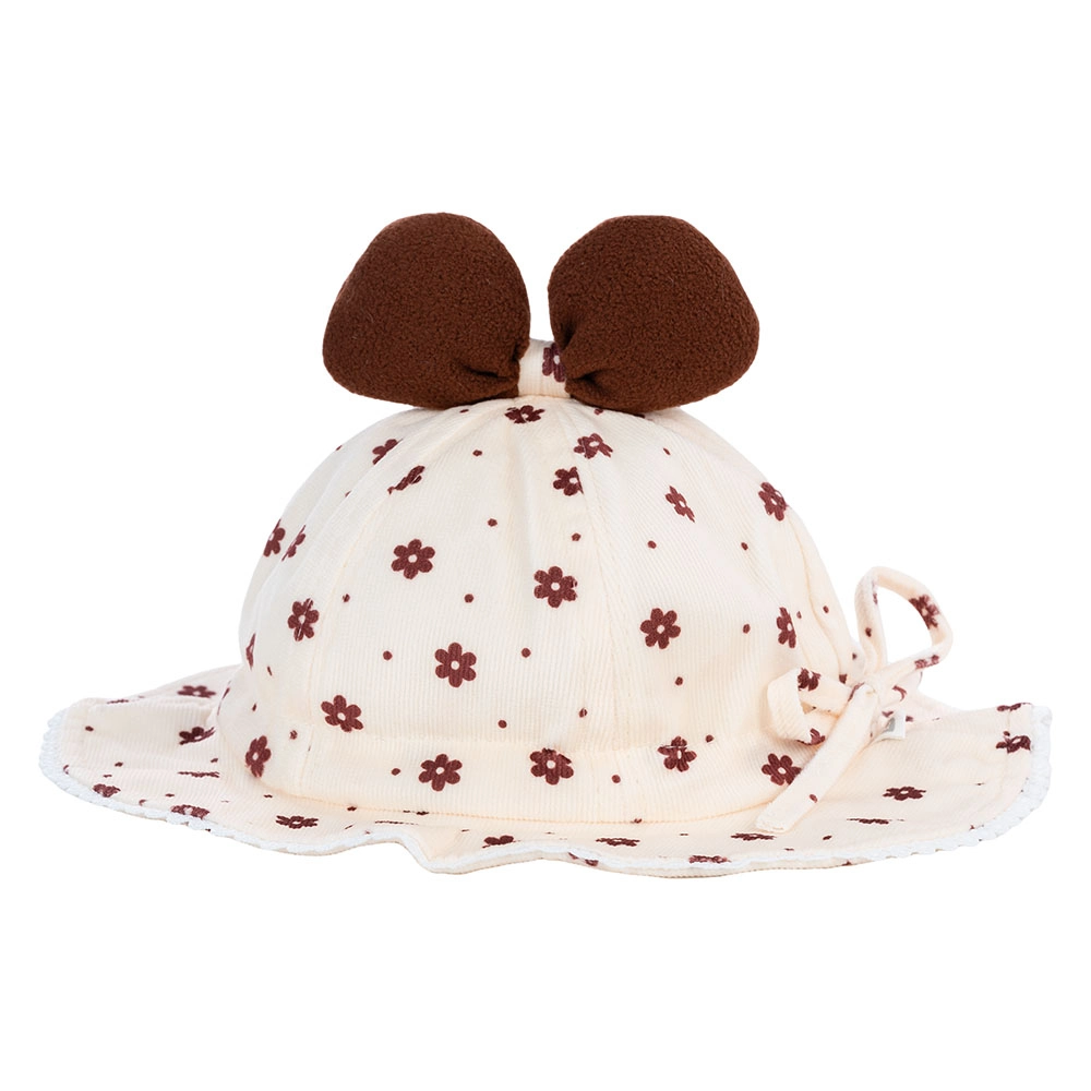 . Hoạ tiết hoa nhí dễ thương cùng nơ trên đỉnh nón giúp tăng nét đáng yêu cho bé;
