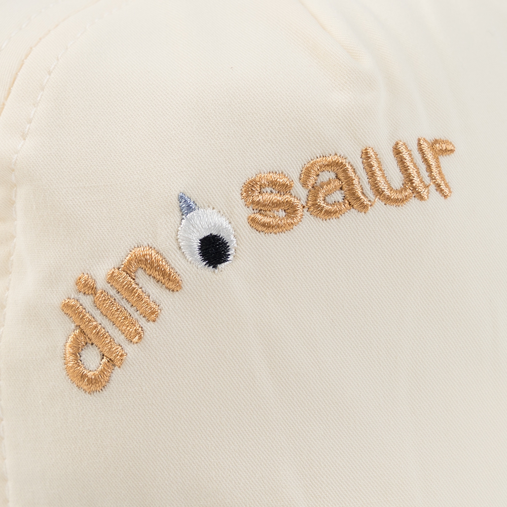Chữ thêu "dinosaur" tỉ mỉ, sắc nét tạo điểm nhấn nổi bật trên nền vải kem.