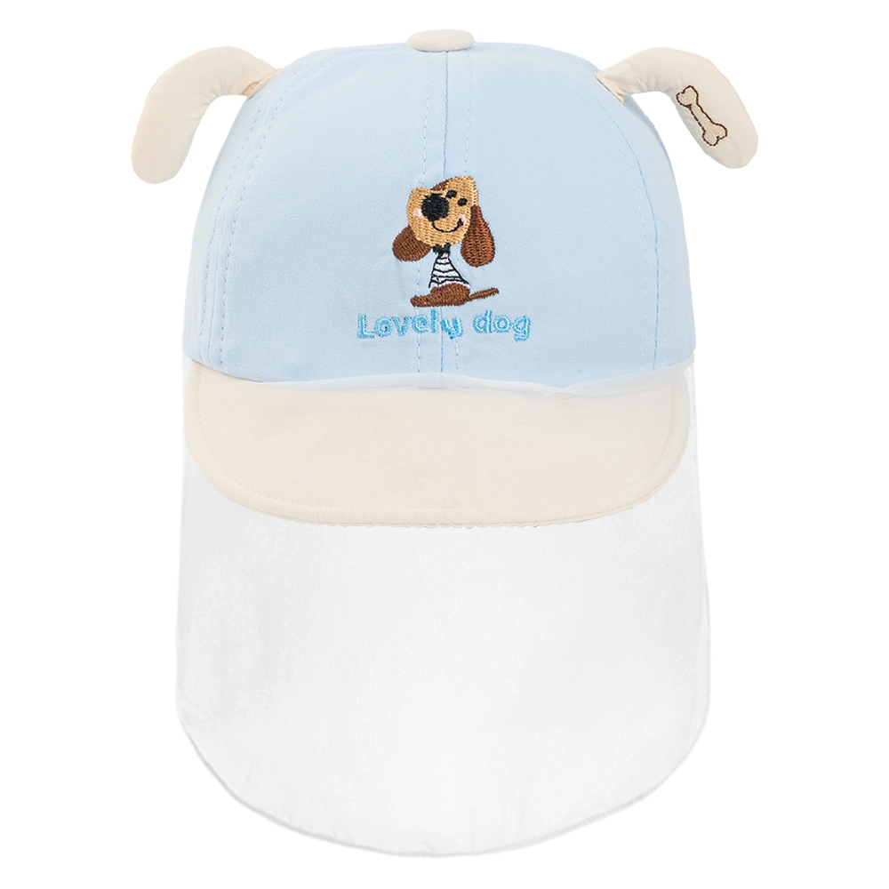 Nón lưỡi trai phối khăn voan che gáy giúp bé được bảo vệ tốt hơn khi ra ngoài. Tông xanh dương mát mắt cùng họa tiết chú cún dễ thương và tai nổi hai bên làm bé thêm đáng yêu. Nón may theo vòng đầu cố định 46cm, phù hợp cho bé 0–12 tháng, không có đồ điều chỉnh nên form đội ôm vừa.