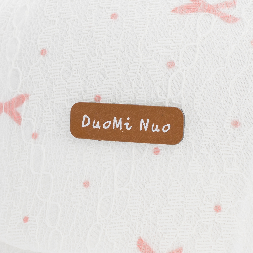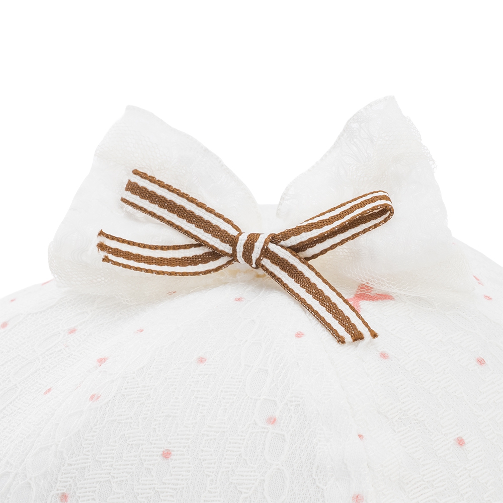 Điểm nhấn nơ vải lớn phía trên kết hợp cùng họa tiết chấm bi và nơ hồng, tạo phong cách nữ tính, ngọt ngào cho bé gái.
