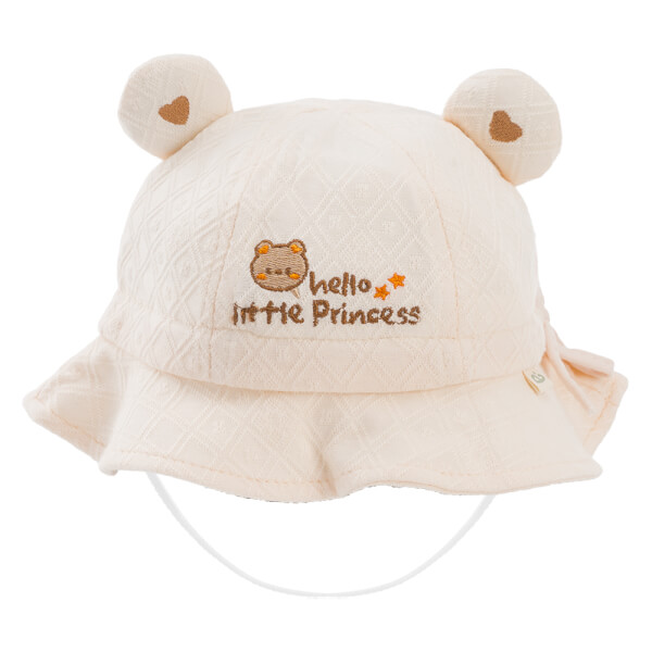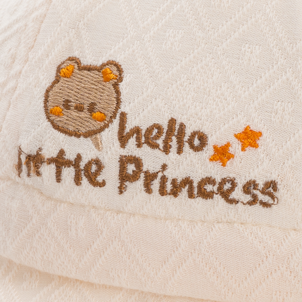 Họa tiết thêu “Hello little princess” sắc nét, kết hợp tai gấu 3D độc đáo, làm tăng vẻ đáng yêu.