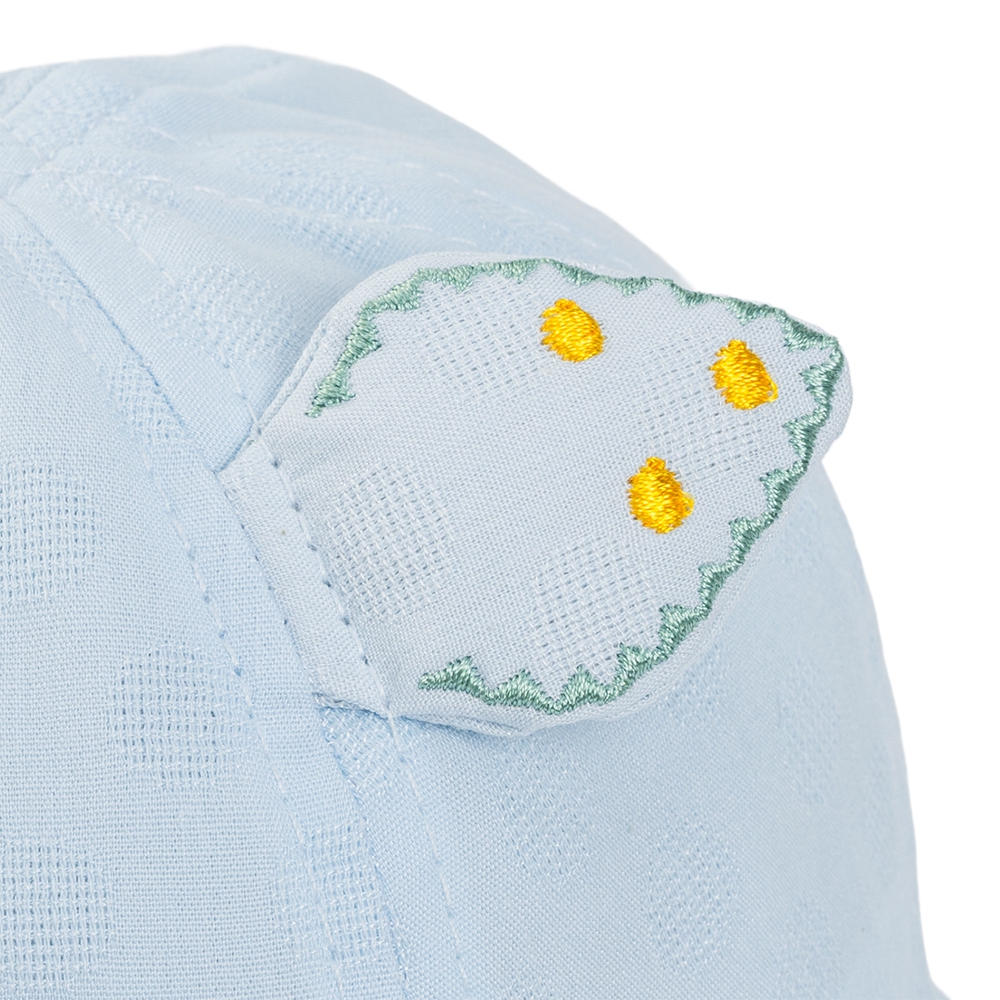 Nón vành tròn phối khăn voan che gáy giúp bảo vệ bé toàn diện khi ra ngoài. Tông xanh nhạt mát mắt cùng tai thỏ dễ thương mang đến vẻ ngoài đáng yêu cho bé. Nón may theo vòng đầu cố định 46cm, kiểu tai bèo form đội ôm vừa vặn.