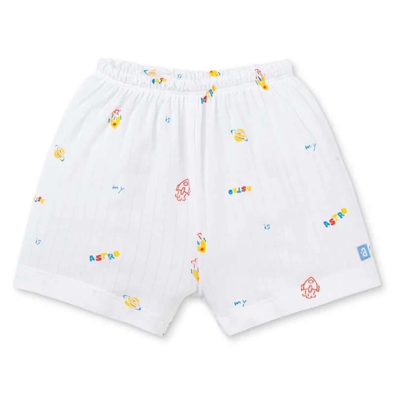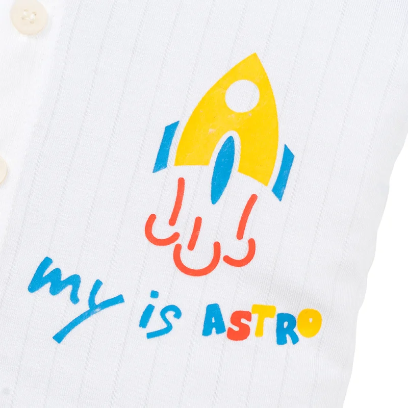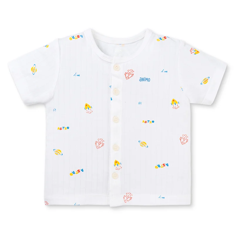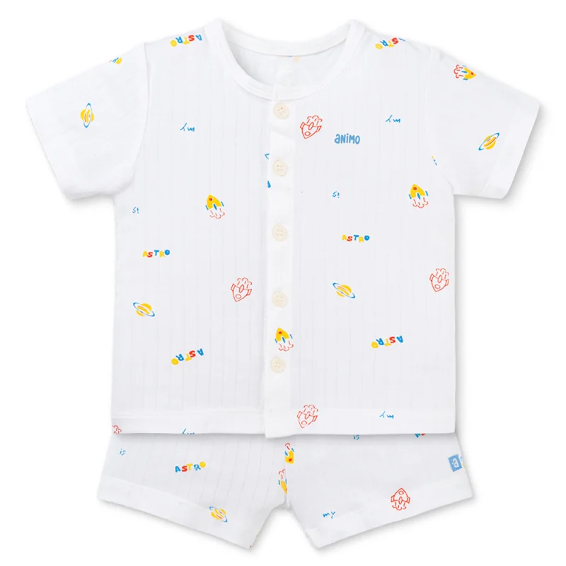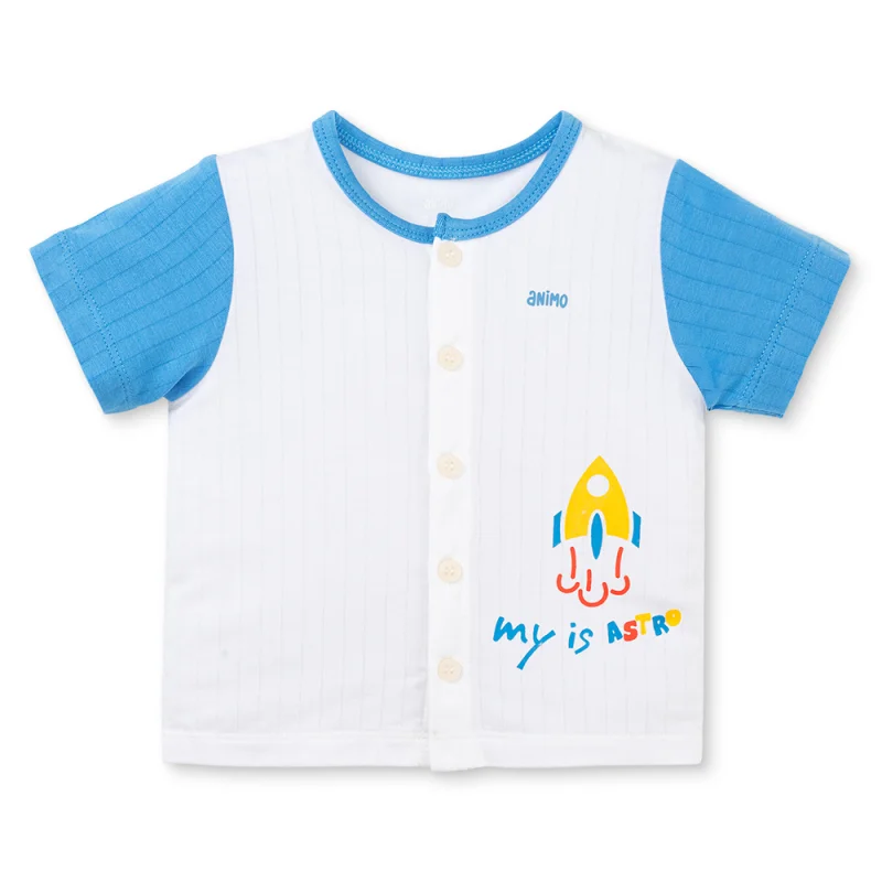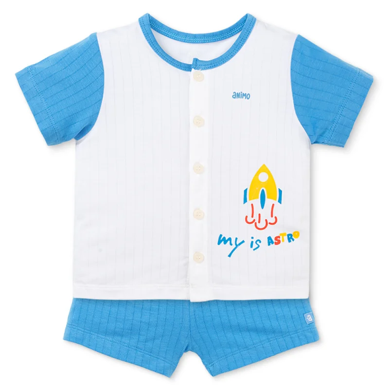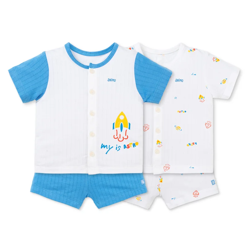 gồm 2 Ưu điểm thiết kế: Set gồm 2 bộ áo tay ngắn và quần short, phối màu trắng – xanh đậm nổi bật. Áo thiết kế tay raglan, hàng nút phía trước giúp thay đồ nhanh chóng, thuận tiện cho bé sơ sinh. Họa tiết phi thuyền “My is Astro” kết hợp các hình in nhỏ tạo cảm giác sinh động, đáng yêu.