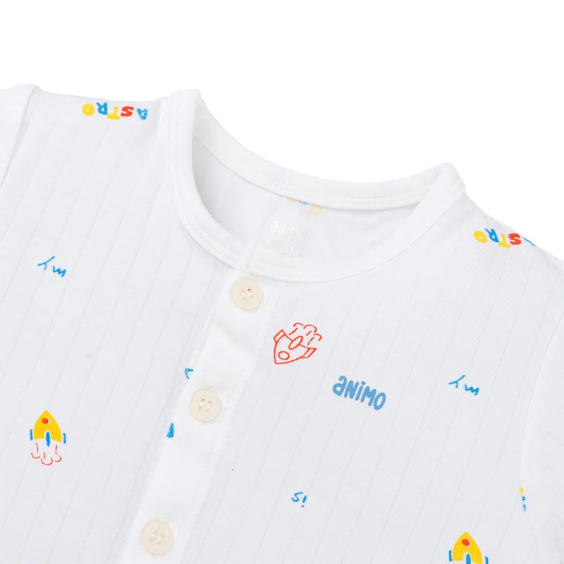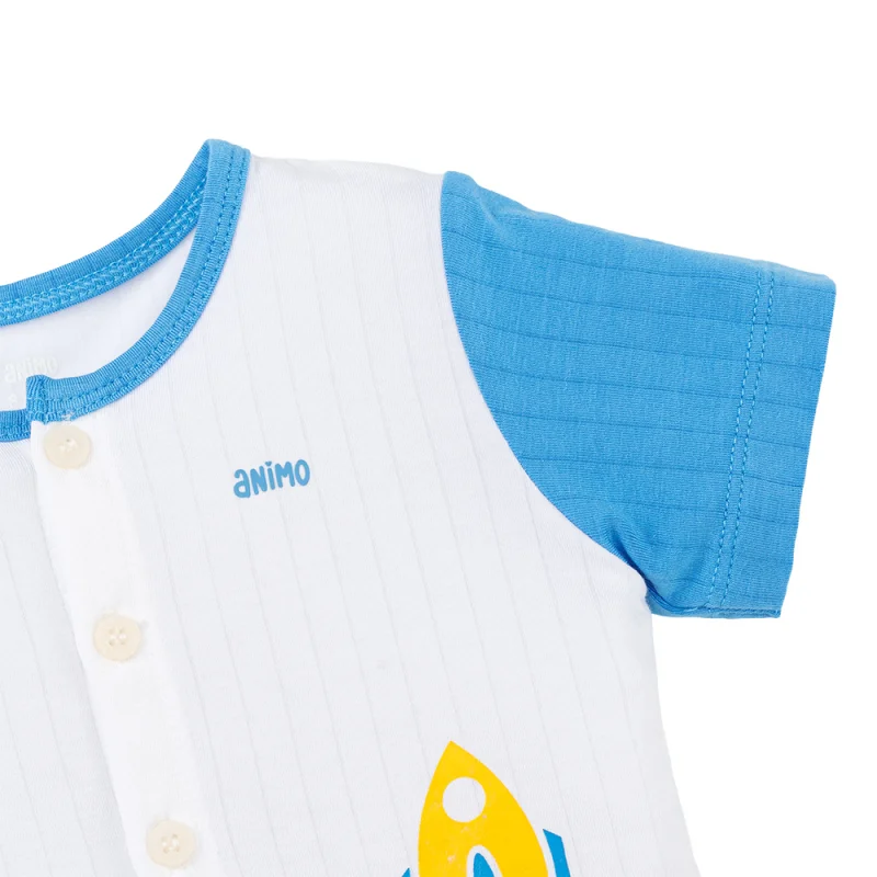 Set 2 bộ kháng khuẩn modal ngắn Animo phối trắng – xanh đậm, họa tiết phi thuyền/astronaut đáng yêu, phù hợp bé 0–24 tháng mặc ở nhà hay đi chơi đều thoải mái, đáng yêu.