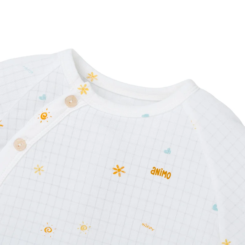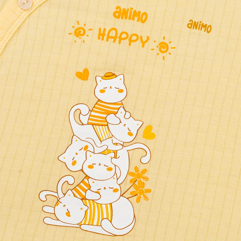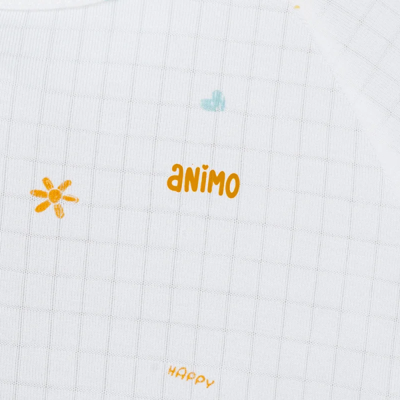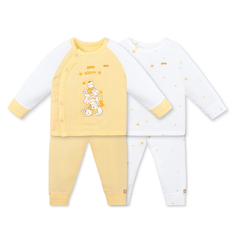 Set 2 bộ rayon chống muỗi dài Animo VD1225024 gồm 2 bộ trắng–vàng kem: một bộ in mèo “Happy”, một bộ họa tiết nhỏ. Thiết kế dài tay dài quần, phù hợp bé 0–24 tháng.