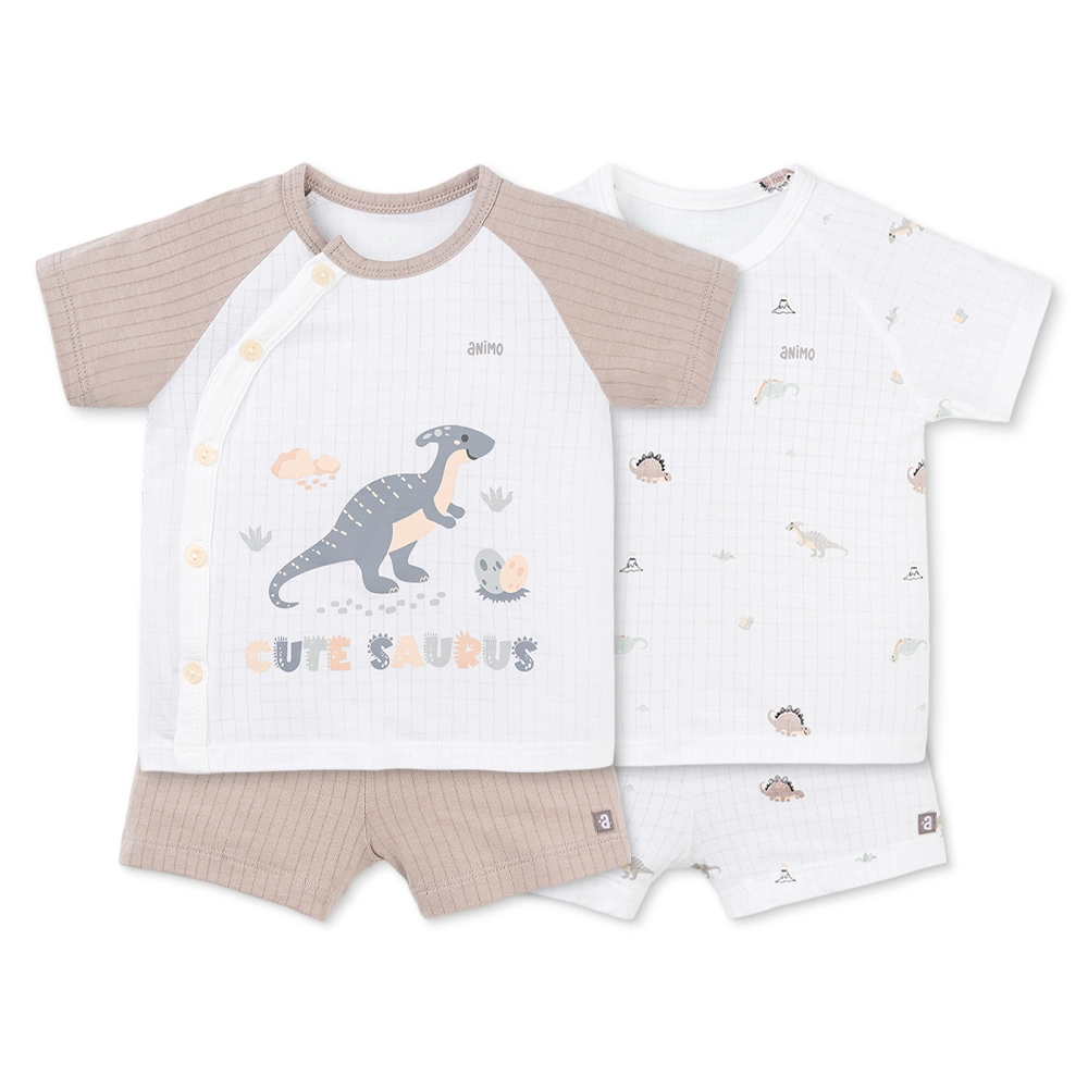 Set 2 bộ rayon chống muỗi ngắn Animo VD1025032 gồm 2 bộ trắng–xám nâu với hình khủng long “Cute saurus” và họa tiết dino nhí trên áo. Chất rayon nhẹ thoáng, hợp bé 0–24 tháng.
