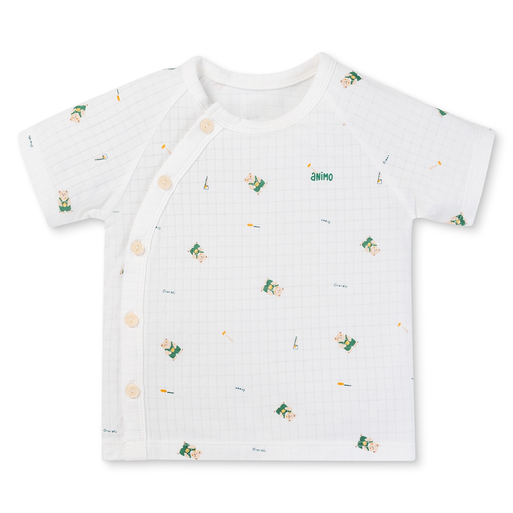 Thiết kế áo cộc tay với hàng nút cài lệch một bên (kiểu raglan) giúp mở rộng phần cổ, ba mẹ dễ dàng thao tác mặc đồ mà không gây khó chịu cho bé.