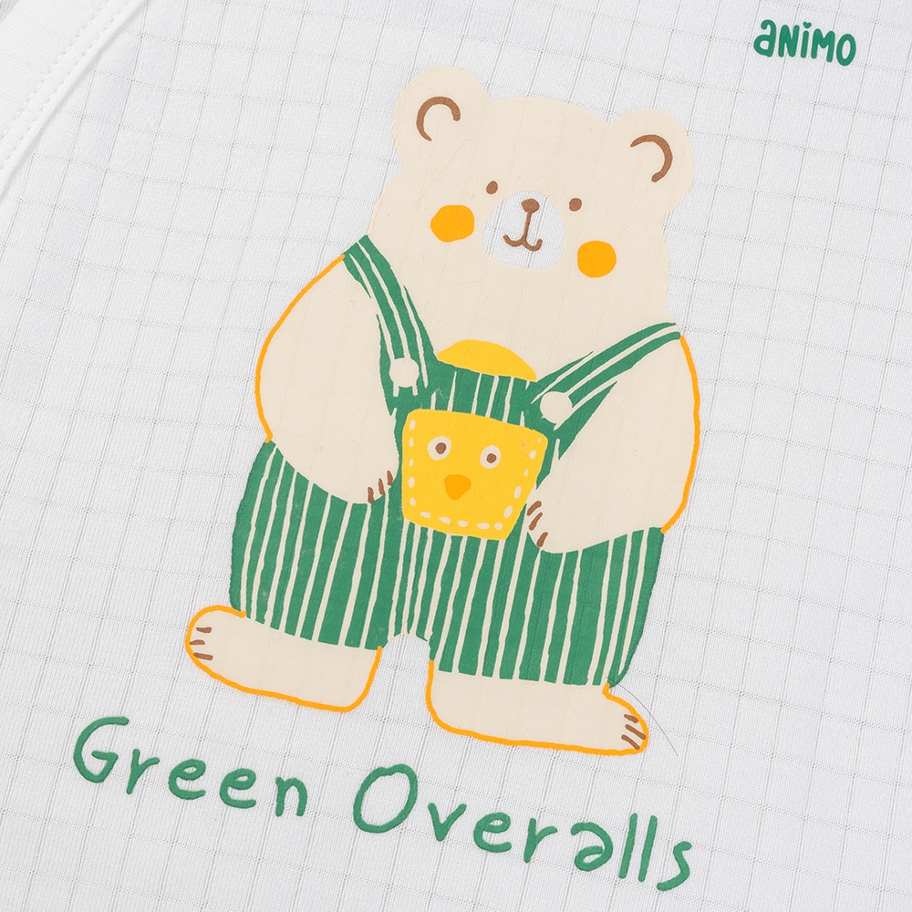 Họa tiết chú gấu mặc yếm "Green Overalls" dễ thương trên nền áo phối tay raglan xanh lá đậm, tạo nên phong cách năng động và đáng yêu cho bé.