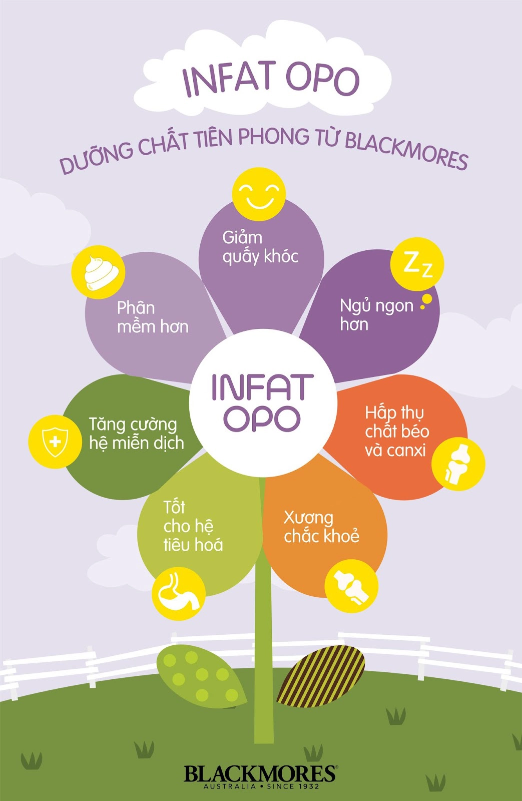 Đặc biệt, sữa Blackmores chứa hoạt chất INFAT OPO (sn-2 palmitate). Đây là một hỗn hợp dầu đặc biệt có cấu trúc và lợi ích tương đương với chất béo có trong sữa mẹ. Thành phần này mang đến nhiều lợi ích cho bé, bao gồm: cải thiện chất lượng giấc ngủ, giảm quấy khóc, giúp phân mềm hơn, tăng cường sức khỏe hệ xương và hỗ trợ hệ vi sinh đường ruột. Sức khỏe của bé nhờ đó ổn định hơn và phát triển một cách hài hòa, cân đối.