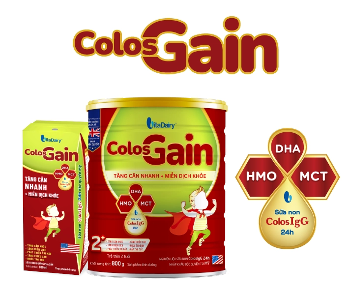 Sữa Colos Gain là sản phẩm dinh dưỡng phù hợp với các bé suy dinh dưỡng, nhẹ cân nhờ công thức chứa nguồn năng lượng cao. Bổ sung sữa non ColosIgG 24h độc quyền từ Mỹ cùng hệ dưỡng chất HMO, MCT, DHA; sữa Colos Gain chính là giải pháp dinh dưỡng đột phá, giúp bé khỏe mạnh, tăng cân tốt và nhanh chóng bắt kịp đà tăng trưởng bình thường.