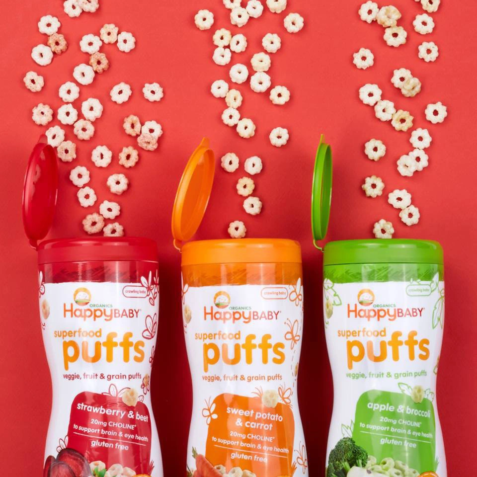 Bánh xốp ăn dặm Puffs Happy (bánh Puffs Happy Baby) là dòng sản phẩm bán chạy của thương hiệu Happy Baby. Đây là thương hiệu đã có gần 20 năm kinh nghiệm trong lĩnh vực sản xuất thực phẩm hữu cơ đến từ Mỹ. Bánh Puffs Happy Baby là kết quả nghiên cứu của các chuyên gia dinh dưỡng hàng đầu nhằm mang lại cho bé những bữa ăn dặm giàu dinh dưỡng và thơm ngon.