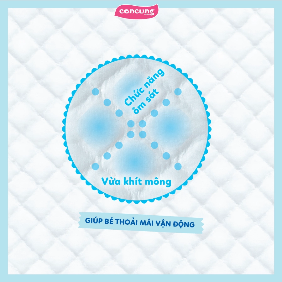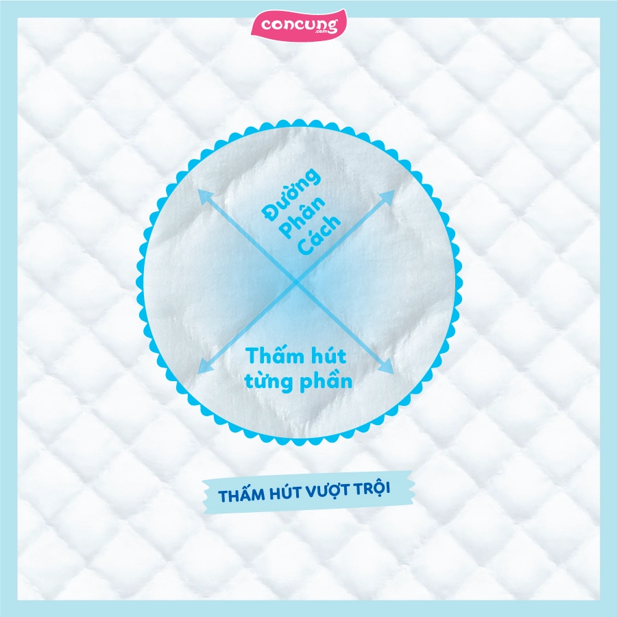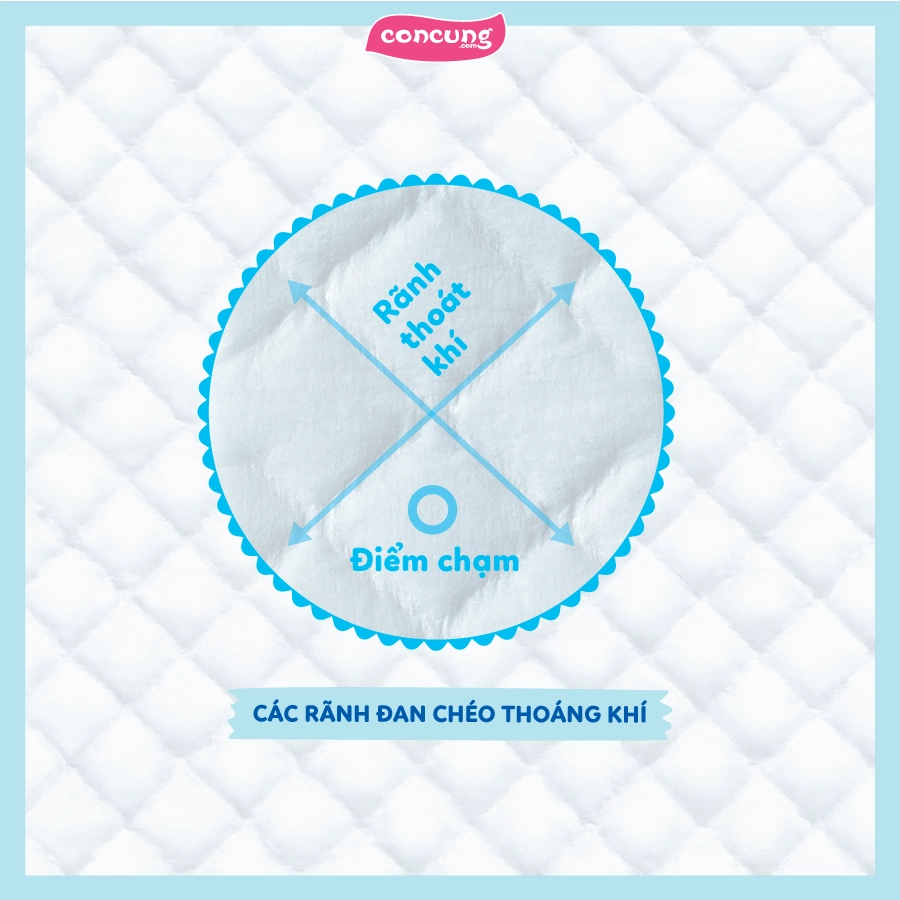 - Khả năng thấm hút nhanh và thoáng khí: Đây đều là hệ quả tuyệt vời từ công nghệ chần bông độc quyền mà Con Cưng đã đề cập ngay từ đầu bài. Công nghệ này giúp thiết kế cho bề mặt tã có các rãnh tã đan chéo nhau. Từ đó mang lại nhiều công dụng đặc biệt gồm:
