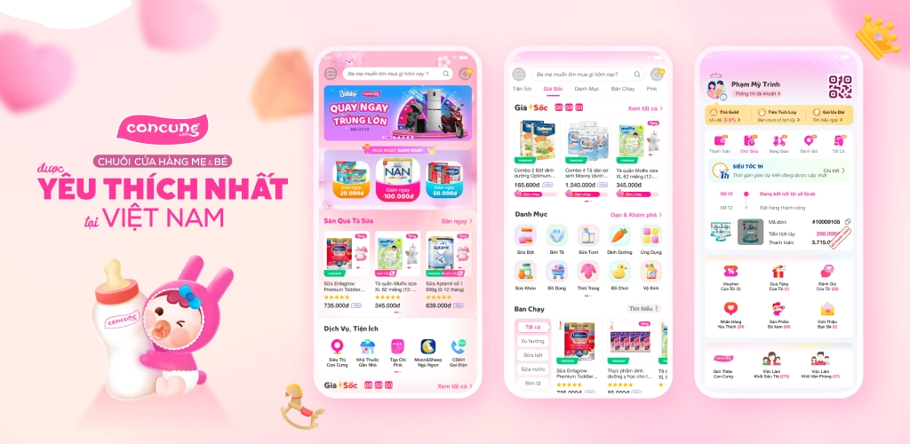 - Mua sắm online qua app Con Cưng/ website concung.com. Phương thức mua sắm này có nhiều ưu điểm như: thao tác đơn giản, khuyến mãi ngập tràn (nhiều khuyến mãi hấp dẫn dành riêng cho ba mẹ mua online), giao hàng siêu tốc 1H…;