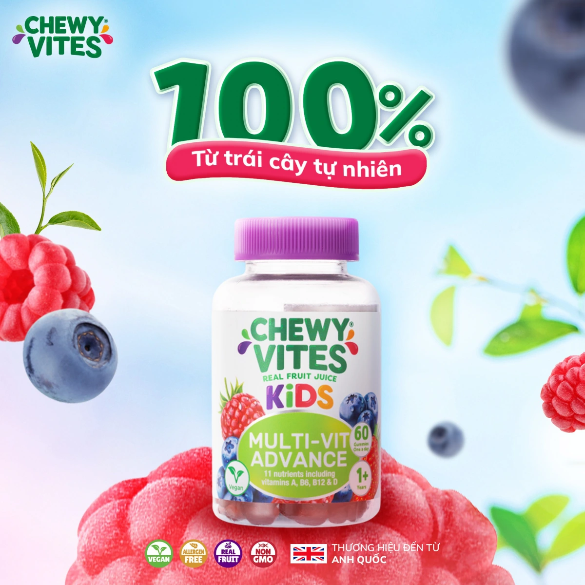 Gummies CHEWY VITES Multivitamin Advance bổ sung cho bé 11 loại vitamin và khoáng chất khác nhau. Đây đều là các dưỡng chất đặc biệt quan trọng đối với bé trong những năm đầu đời. Đặc biệt, trong một viên Gummies CHEWY VITES Multivitamin Advance chứa 100% RI* các loại vitamin D, A, B12, axit folic & biotin (*RI = Reference Intake - nhu cầu dinh dưỡng khuyến nghị hằng ngày). Theo đó, 1 viên gummy mỗi ngày có thể bổ sung đầy đủ các vitamin trên theo nhu cầu dinh dưỡng khuyến nghị, để bé phát triển khỏe mạnh.