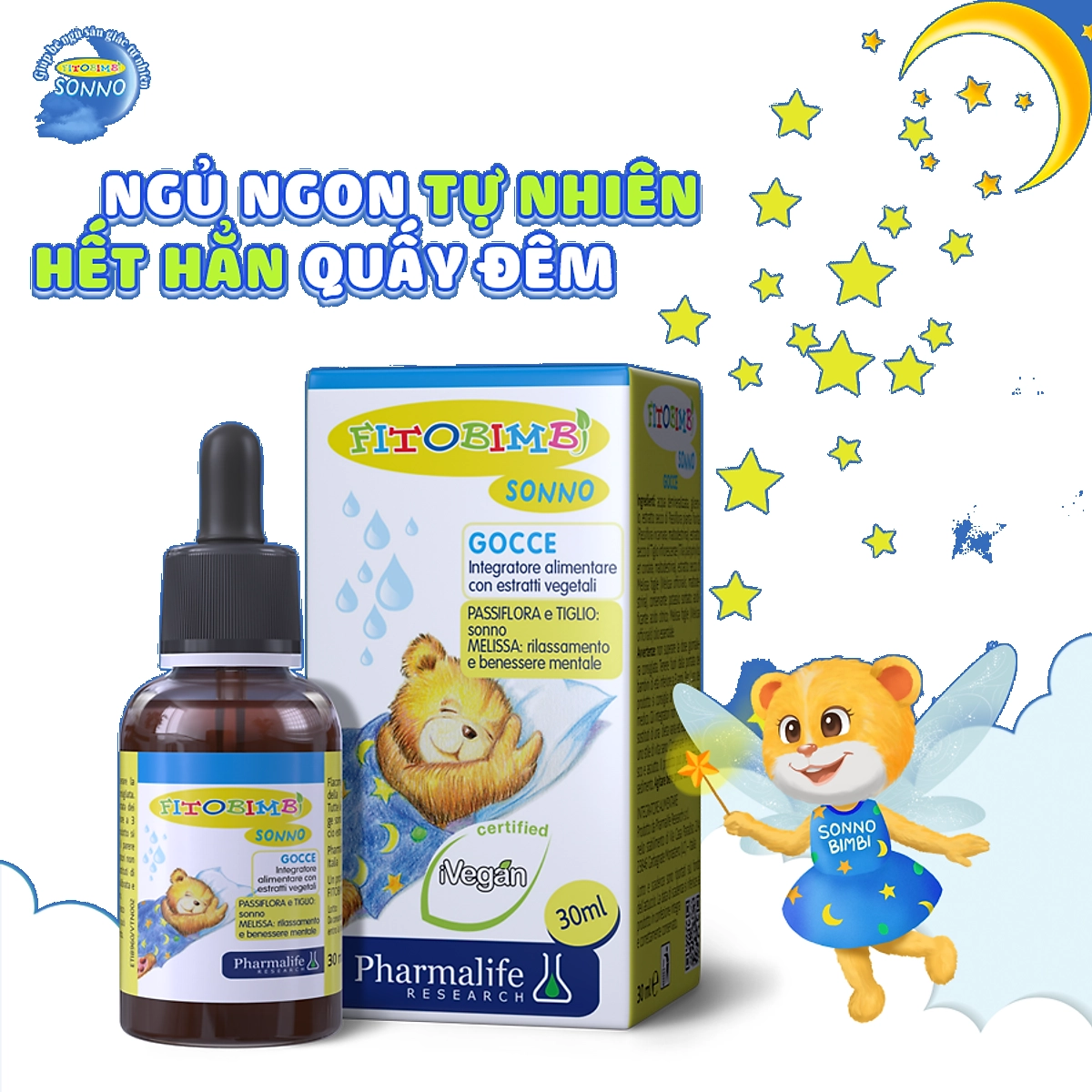 Theo Tiến sĩ, bác sĩ Marianna Crupi (Founder – CEO Pharmalife Research), có rất nhiều nguyên nhân gây ra chứng quấy khóc, trằn trọc khi ngủ ở bé, chẳng hạn: cơ thể thiếu hụt các dưỡng chất thiết yếu (sắt, canxi, kẽm), khó tiêu, đầy bụng, mắc bệnh viêm đường hô hấp,... Để giúp bé cải thiện giấc ngủ, Pharmalife Research đã kết hợp các thành phần thuần thực vật kể trên vào Fitobimbi Sonno nhằm đem lại 2 tác động chính: