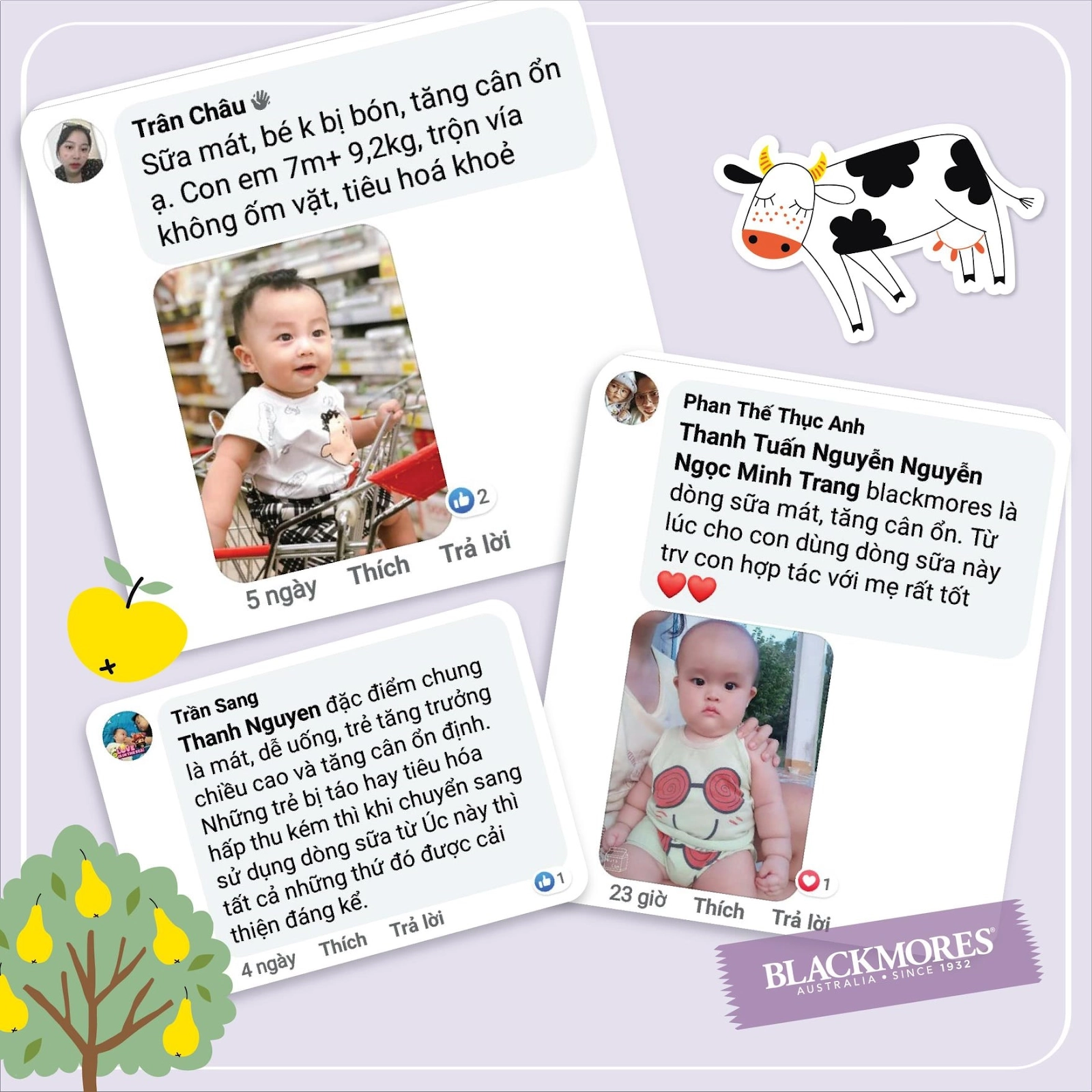 Mẹ Châu, ba Sang, mẹ Thục Anh vui mừng chia sẻ về sự cải thiện cân nặng của con sau khi dùng sữa Blackmores số 2 (Nguồn: Internet)