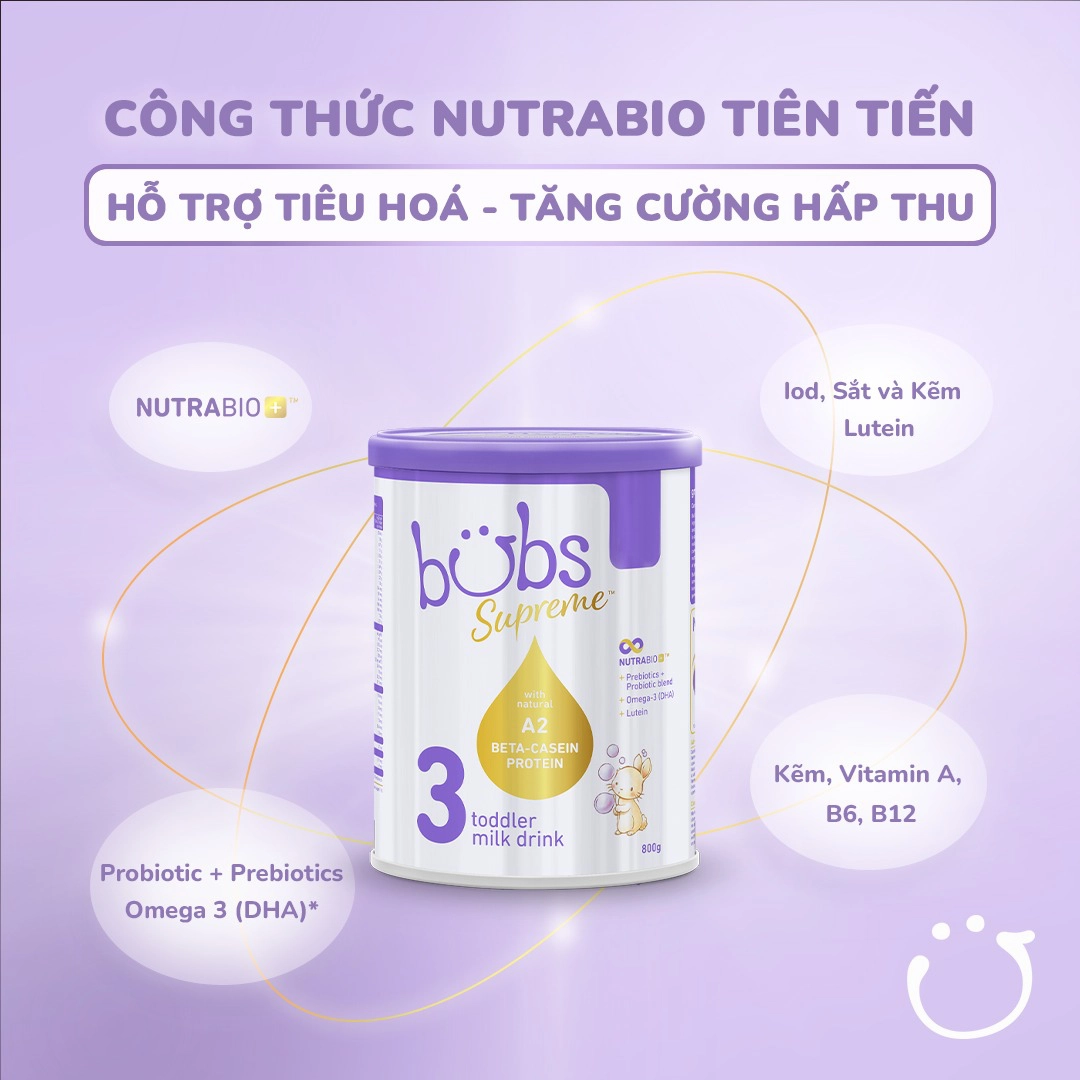 Hơn nữa, sữa Bubs Supreme số 3 còn sở hữu công thức NutraBio+ độc đáo. Công thức này kết hợp đa dạng các loại dưỡng chất giúp bé phát triển khoẻ mạnh như: DHA, Lutein, Canxi, vitamin D, E, A,... Ngoài ra, công thức NutraBio+ còn bổ sung bộ đôi lợi khuẩn FOS và GOS giúp cân bằng hệ vi sinh đường ruột cho bé.