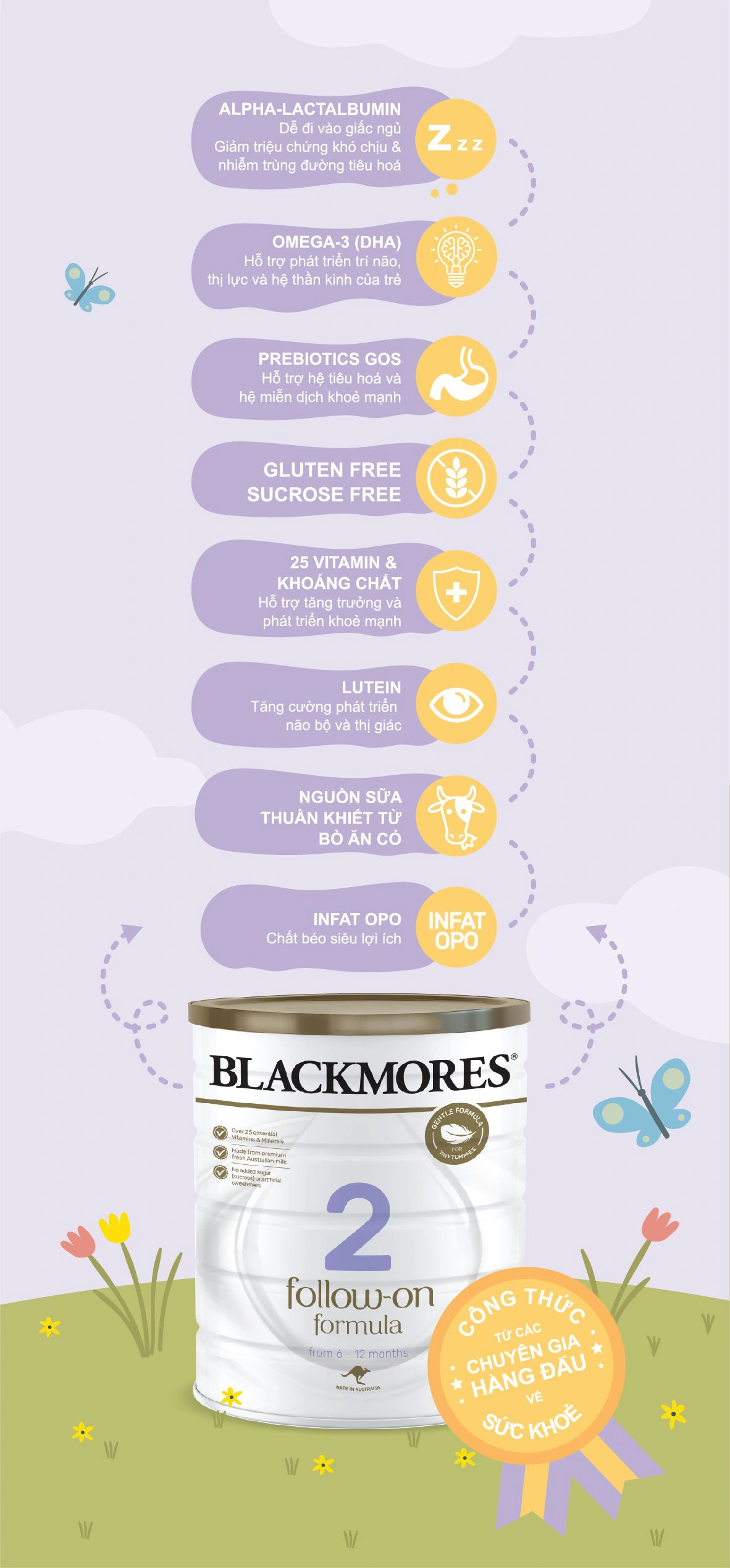 Không chỉ vậy, sữa Blackmores số 2 còn chứa hoạt chất alpha-lactalbumin. Hoạt chất này đóng vai trò quan trọng trong việc hạn chế tình trạng nhiễm trùng đường tiêu hóa ở trẻ, đồng thời giúp bé ngủ ngon tròn giấc hơn.