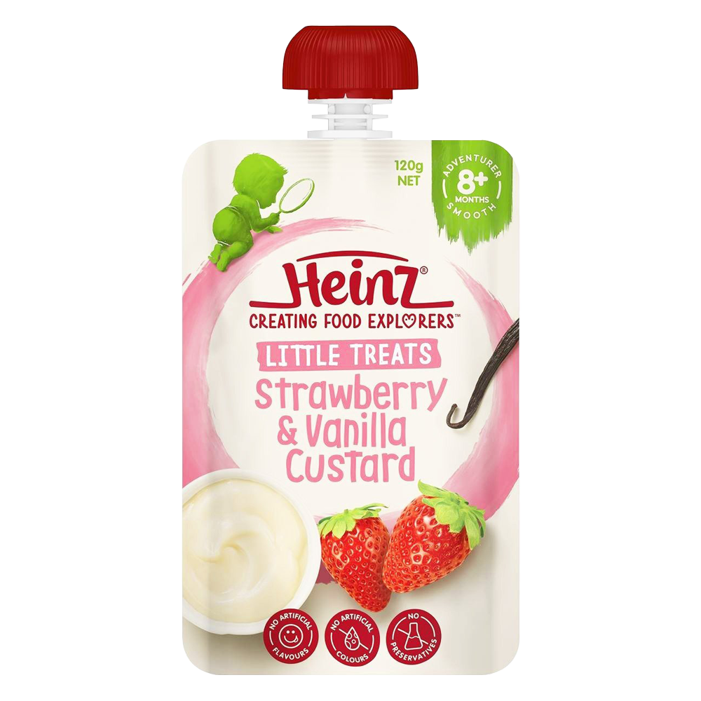 Hỗn hợp nghiền dành cho trẻ 8 tháng tuổi trở lên : Custard Dâu và Vani - Heinz Strawberry & Vanilla custard.