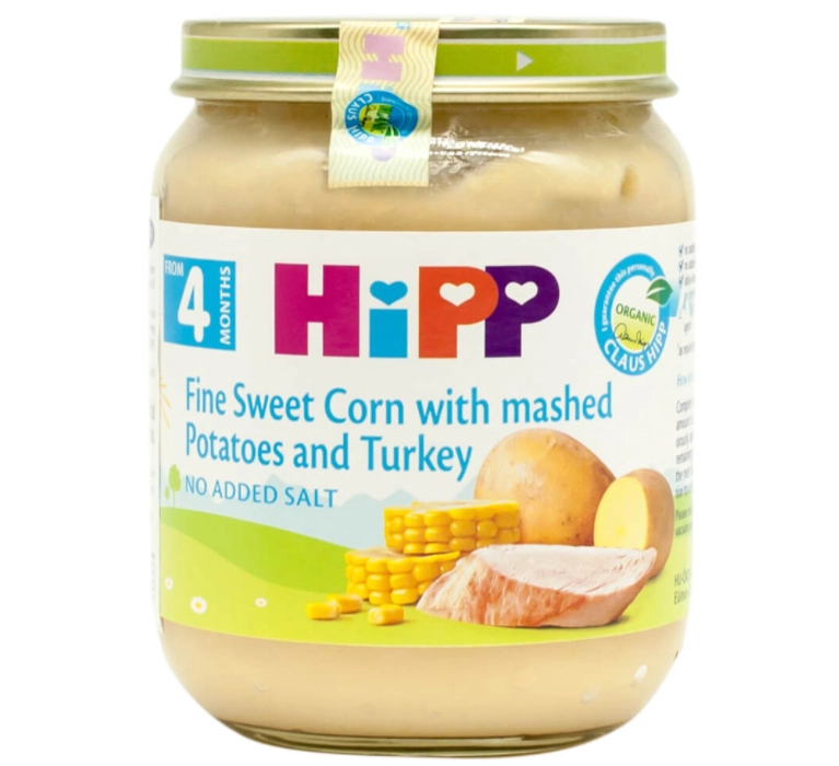 - Dinh dưỡng đóng lọ HiPP Bio - Ngô bao tử, khoai tây, gà tây 125g là thực phẩm bổ sung và được ăn thêm cùng với sữa mẹ hoặc sữa công thức, mùi vị thơm ngon, không hương liệu.