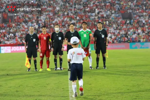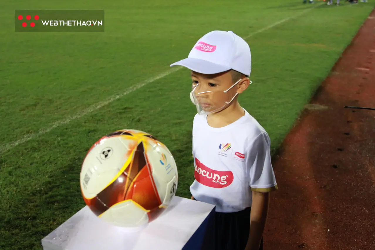 Bé Văn Quân - con trai tiền đạo Văn Quyết giao bóng thi đấu cho trọng tài chính trong trận đấu giữa U23 Việt Nam vs U23 Indonesia trên SVĐ Việt Trì ở SEA Games 31.