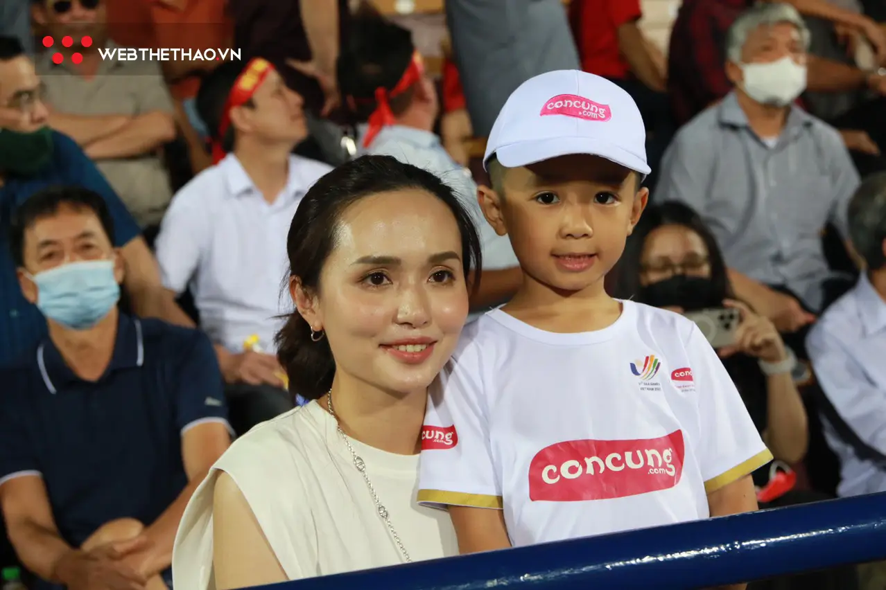 Huyền Mi, vợ Văn Quyết cùng cậu con trai đã có mặt tại SVĐ Việt Trì từ rất sớm để cổ vũ U23 Việt Nam và thực hiện nhiệm vụ đặc biệt này.