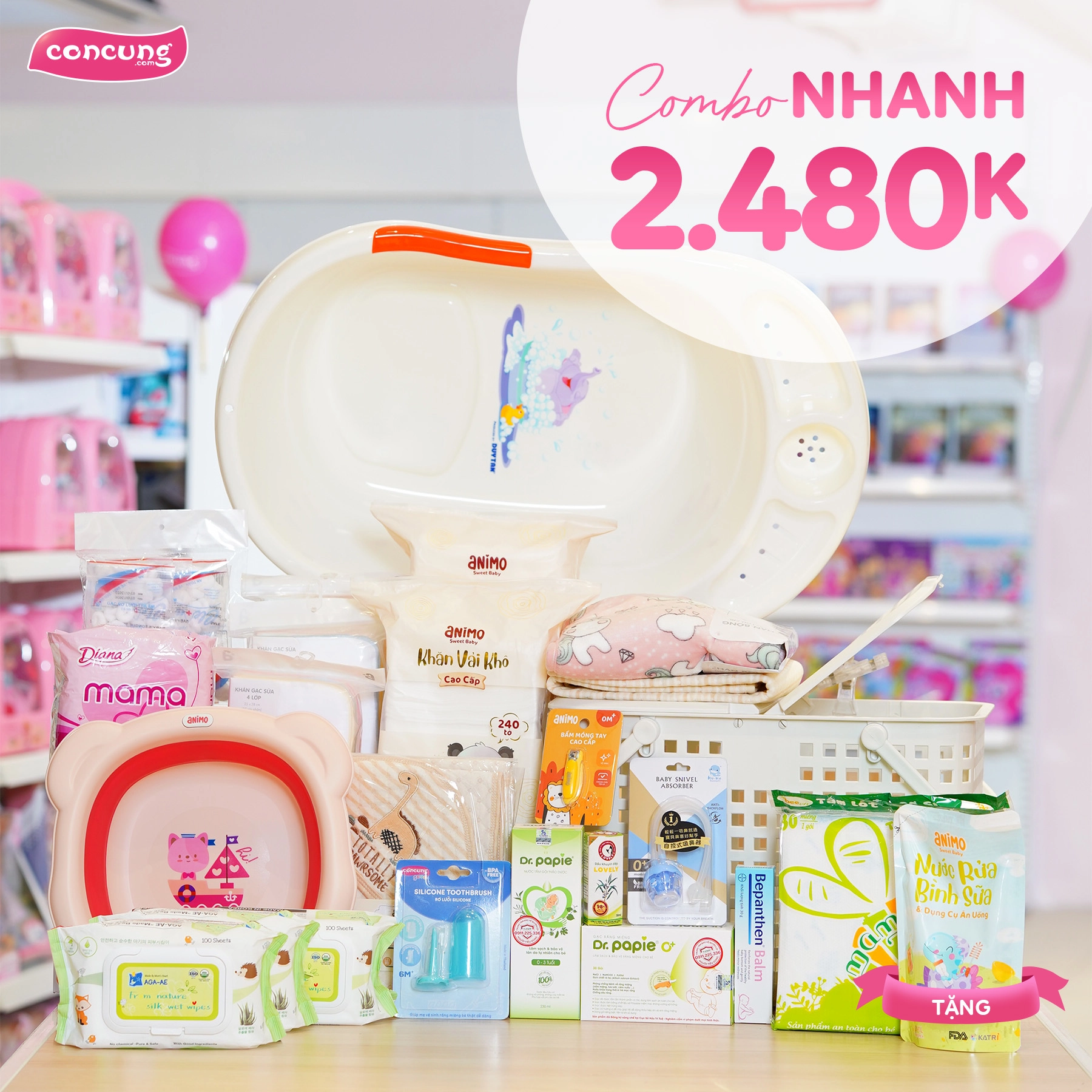 . Combo đi sinh Nhanh (bao gồm 15 sản phẩm dành cho mẹ bầu & em bé) giá 2.480.000 đồng sẽ nhận được 1 bộ quà tặng bao gồm: 1 bình sữa MAM 130ml, 1 Voucher giảm 200.000 đồng khi mua men vi sinh SynterAct và 1 Túi nước rửa bình sữa Animo 500ml.